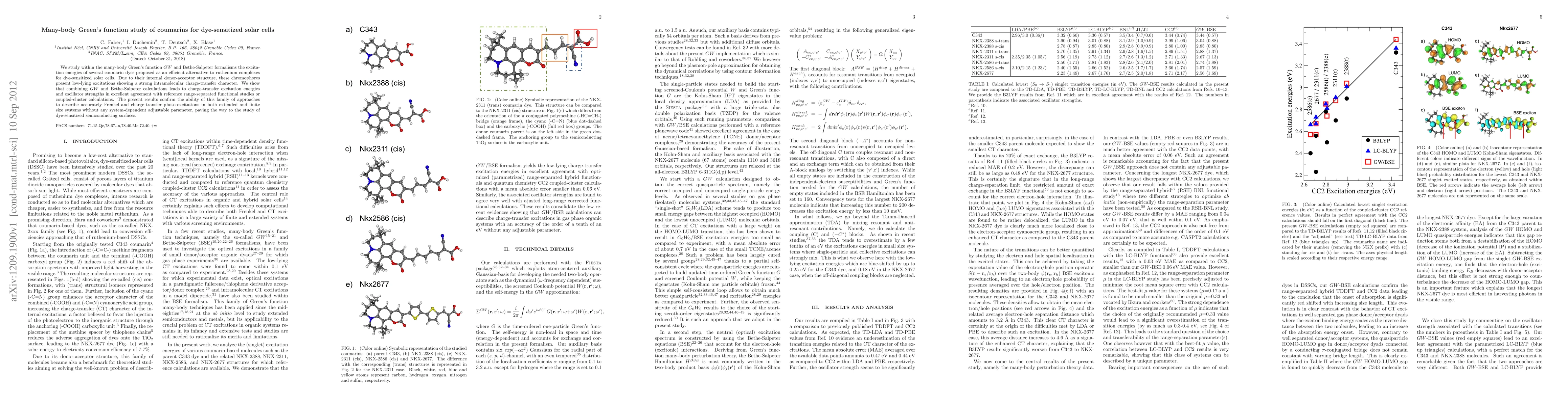 This paper investigates the excitation energies of coumarin dyes using many-body Green's function $GW$ and Bethe-Salpeter formalisms, finding they are efficient alternatives to ruthenium complexes for dye-sensitized solar cells due to their strong intramolecular charge-transfer character. The study confirms the accuracy of the $GW$ and Bethe-Salpeter methods in describing both Frenkel and charge-transfer excitations without adjustable parameters.