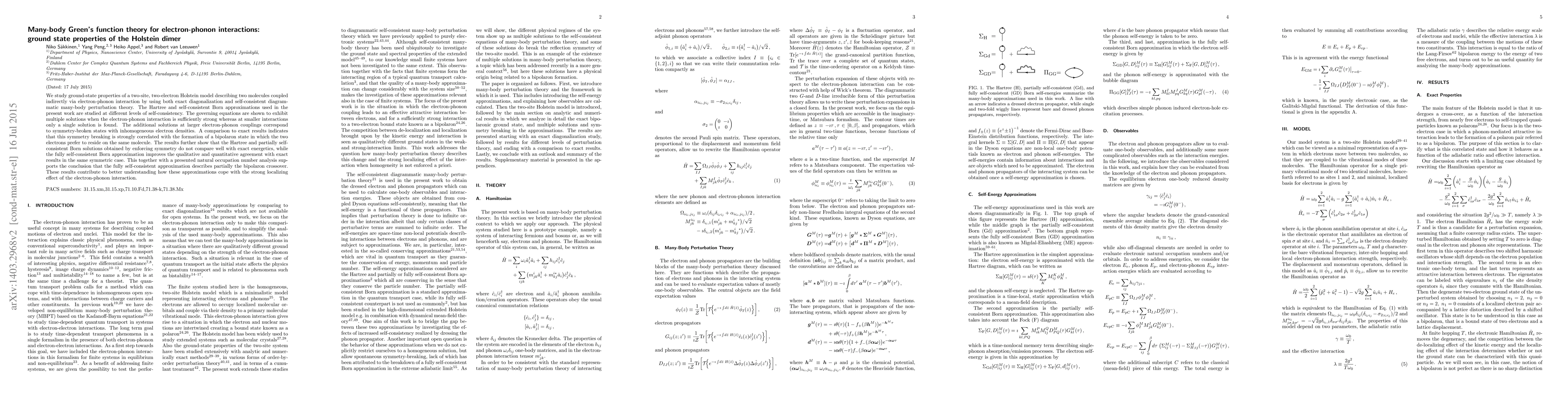 We study ground-state properties of a two-site, two-electron Holstein model describing two molecules coupled indirectly via electron-phonon interaction by using both exact diagonalization and self-consistent diagrammatic many-body perturbation theory. The Hartree and self-consistent Born approximations used in the present work are studied at different levels of self-consistency. The governing equations are shown to exhibit multiple solutions when the electron-phonon interaction is sufficiently strong whereas at smaller interactions only a single solution is found. The additional solutions at larger electron-phonon couplings correspond to symmetry-broken states with inhomogeneous electron densities. A comparison to exact results indicates that this symmetry breaking is strongly correlated with the formation of a bipolaron state in which the two electrons prefer to reside on the same molecule. The results further show that the Hartree and partially self-consistent Born solutions obtained by enforcing symmetry do not compare well with exact energetics, while the fully self-consistent Born approximation improves the qualitative and quantitative agreement with exact results in the same symmetric case. This together with a presented natural occupation number analysis supports the conclusion that the fully self-consistent approximation describes partially the bipolaron crossover. These results contribute to better understanding how these approximations cope with the strong localizing effect of the electron-phonon interaction.