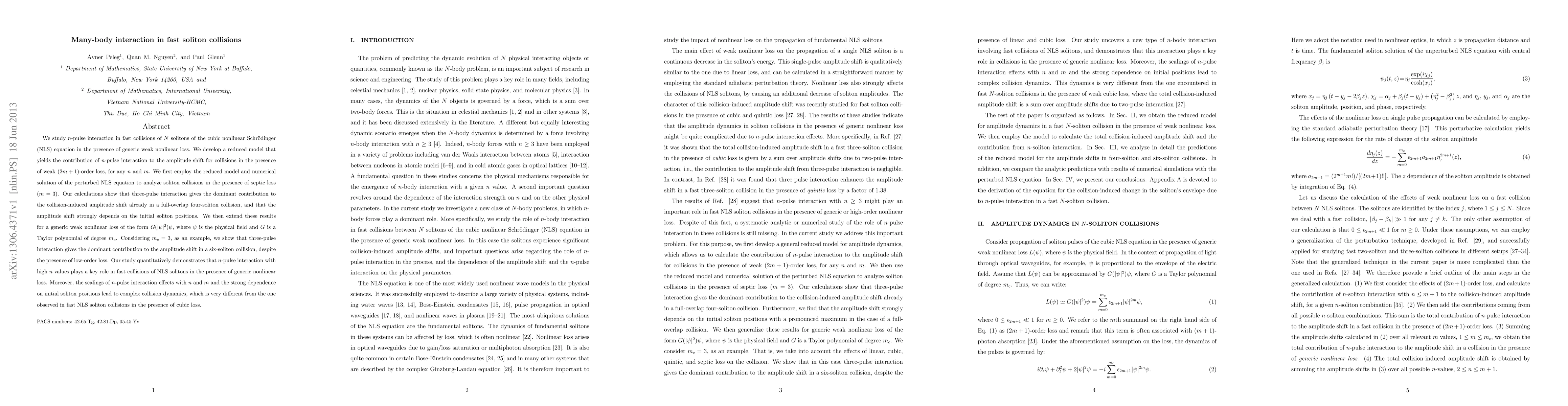 This paper investigates the many-body interactions in fast soliton collisions within the cubic nonlinear Schrödinger equation, focusing on the impact of generic weak nonlinear loss. The study reveals that high-order $n$-pulse interactions significantly influence the amplitude shift during collisions, especially in scenarios with low-order loss, leading to complex dynamics dependent on initial soliton positions.