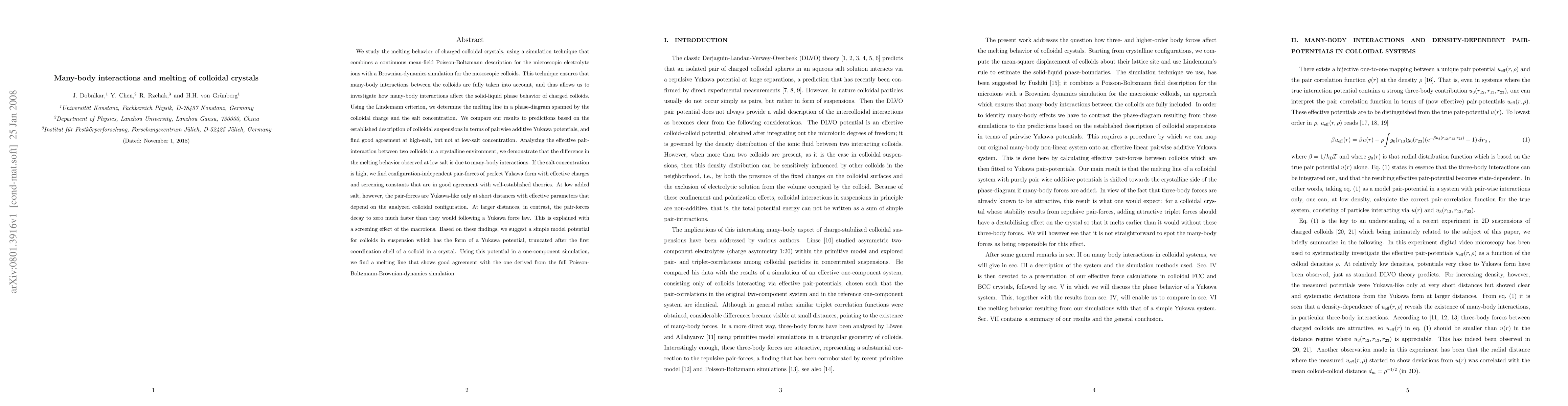 This paper investigates the melting behavior of charged colloidal crystals using a simulation technique that considers many-body interactions, revealing that these interactions significantly affect the melting line at low salt concentrations, contrasting with predictions based on pairwise interactions. The study employs a combination of mean-field Poisson-Boltzmann and Brownian-dynamics simulations.