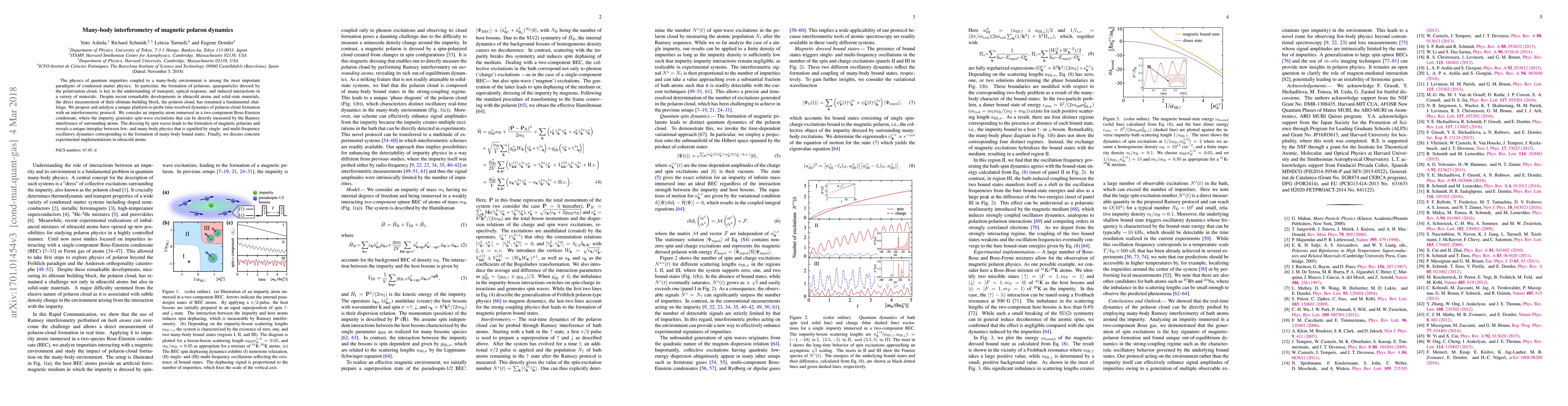This paper proposes an interferometric method to directly measure the dynamics of magnetic polaron formation in a many-body system, using an impurity atom in a Bose-Einstein condensate to generate and observe spin-wave excitations. The study highlights the interplay between few- and many-body physics through oscillatory dynamics revealing many-body bound states.