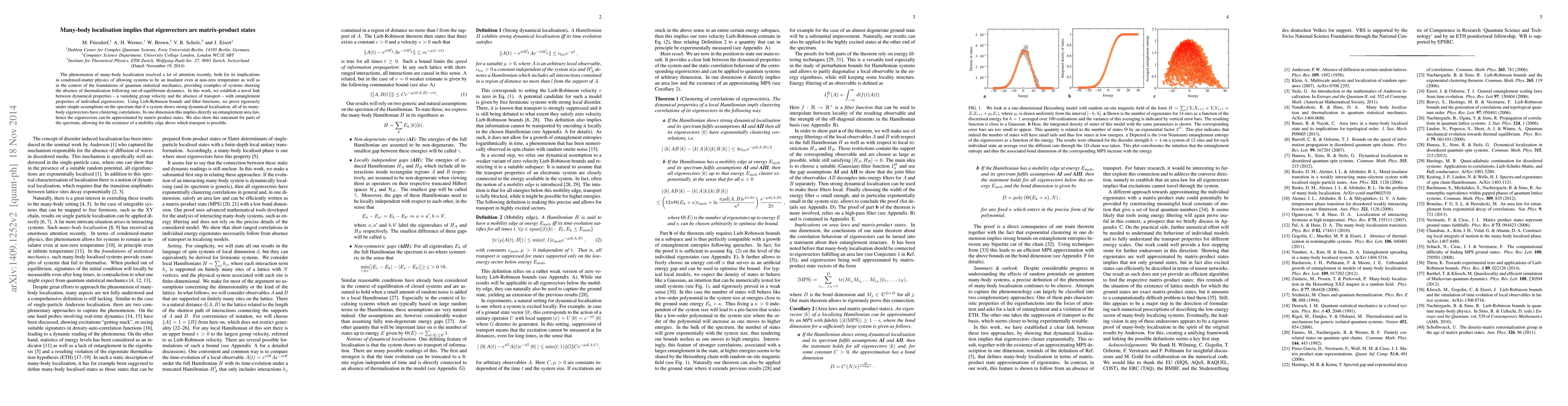 This paper establishes a connection between many-body localisation and entanglement properties, proving that systems exhibiting strong dynamical localisation have eigenvectors that can be approximated by matrix-product states, implying an entanglement area law in one dimension. The findings extend to parts of the spectrum with a mobility edge, indicating the potential for transport above this edge.