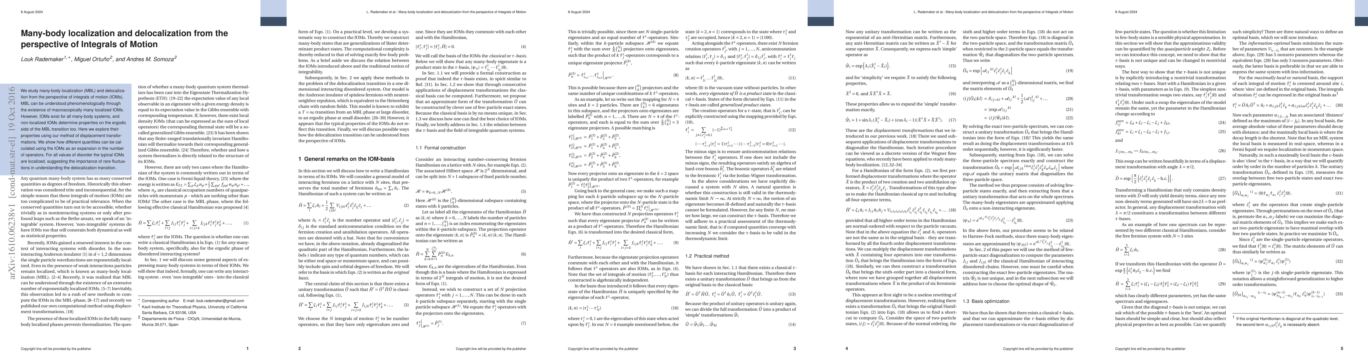 This paper investigates many-body localization (MBL) and delocalization through the lens of integrals of motion (IOMs), revealing that localized IOMs are key to MBL, while non-localized IOMs influence ergodic systems. The study uses displacement transformations to explore IOM properties and suggests that rare fluctuations play a crucial role in the delocalization transition.