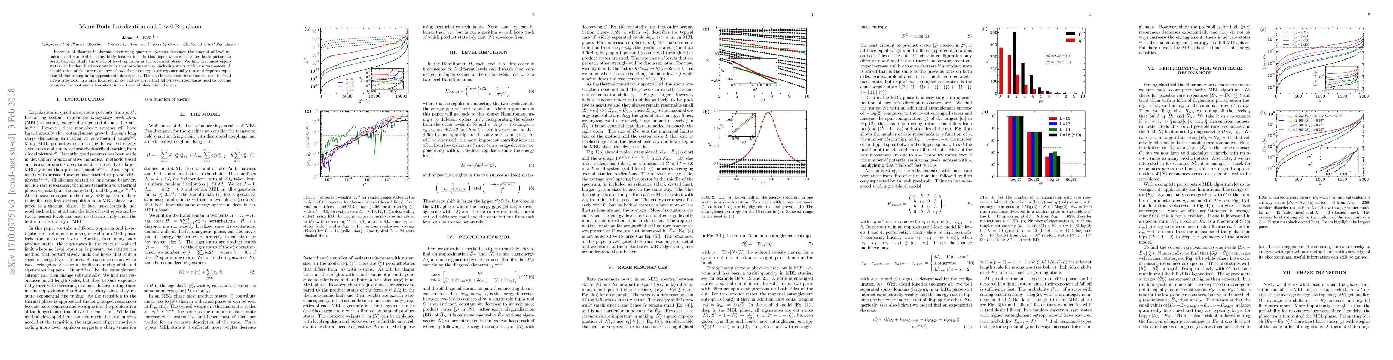 Insertion of disorder in thermal interacting quantum systems decreases the amount of level repulsion and can turn them into many body localized phases. In this paper we use the many body picture to perturbatively study the effect of level repulsion in the localized phase. We find that most eigenstates can be described accurately in an approximate way, including many with rare resonances. A classification of the rare resonances shows that most types are exponentially rare and requires exponential fine tuning in an approximate description. The classification confirms that no rare thermal eigenstates can exist in a fully localized phase and we argue that all types of resonances need to become common if a continuous transition into a thermal phase should occur.