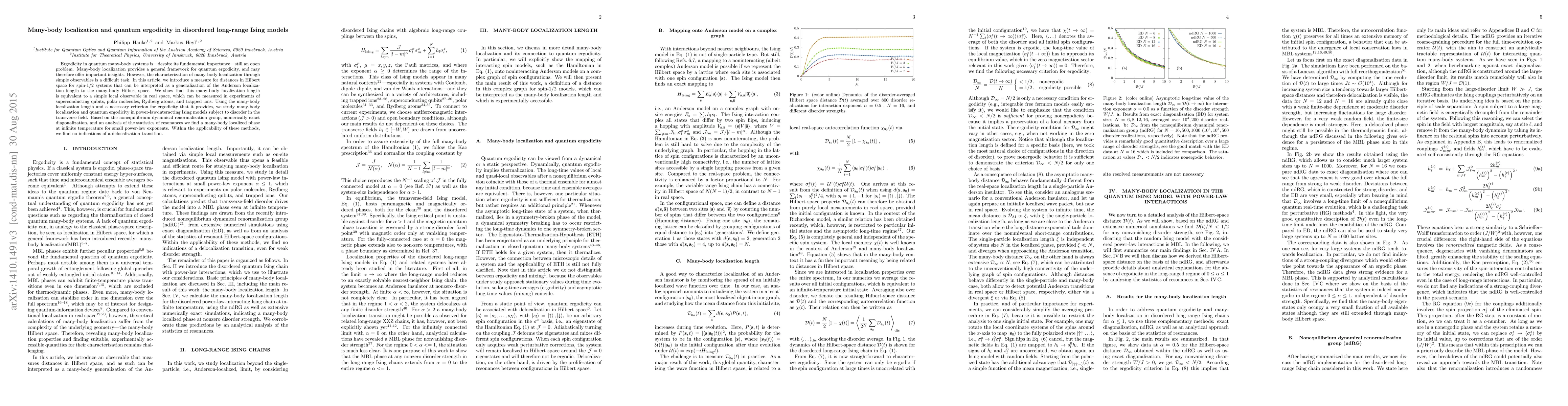 Ergodicity in quantum many-body systems is - despite its fundamental importance - still an open problem. Many-body localization provides a general framework for quantum ergodicity, and may therefore offer important insights. However, the characterization of many-body localization through simple observables is a difficult task. In this article, we introduce a measure for distances in Hilbert space for spin-1/2 systems that can be interpreted as a generalization of the Anderson localization length to the many-body Hilbert space. We show that this many-body localization length is equivalent to a simple local observable in real space, which can be measured in experiments of superconducting qubits, polar molecules, Rydberg atoms, and trapped ions. Using the many-body localization length and a necessary criterion for ergodicity that it provides, we study many-body localization and quantum ergodicity in power-law-interacting Ising models subject to disorder in the transverse field. Based on the nonequilibrium dynamical renormalization group, numerically exact diagonalization, and an analysis of the statistics of resonances we find a many-body localized phase at infinite temperature for small power-law exponents. Within the applicability of these methods, we find no indications of a delocalization transition.