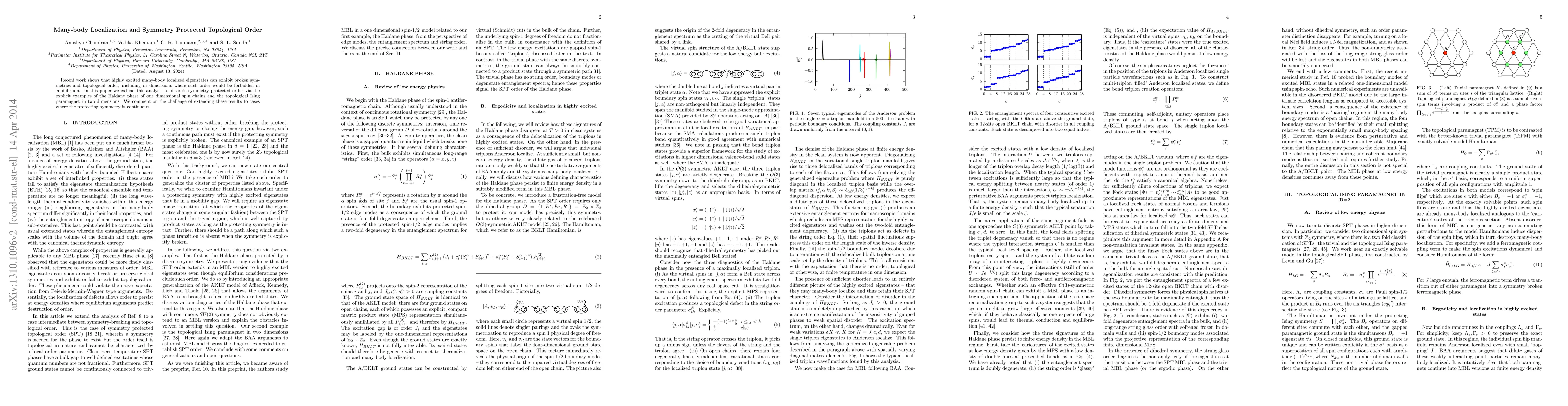 This paper explores many-body localization in systems with broken symmetries and topological order, using the Haldane phase and topological Ising paramagnet as examples. It discusses the implications and challenges of extending these findings to systems with continuous symmetries.