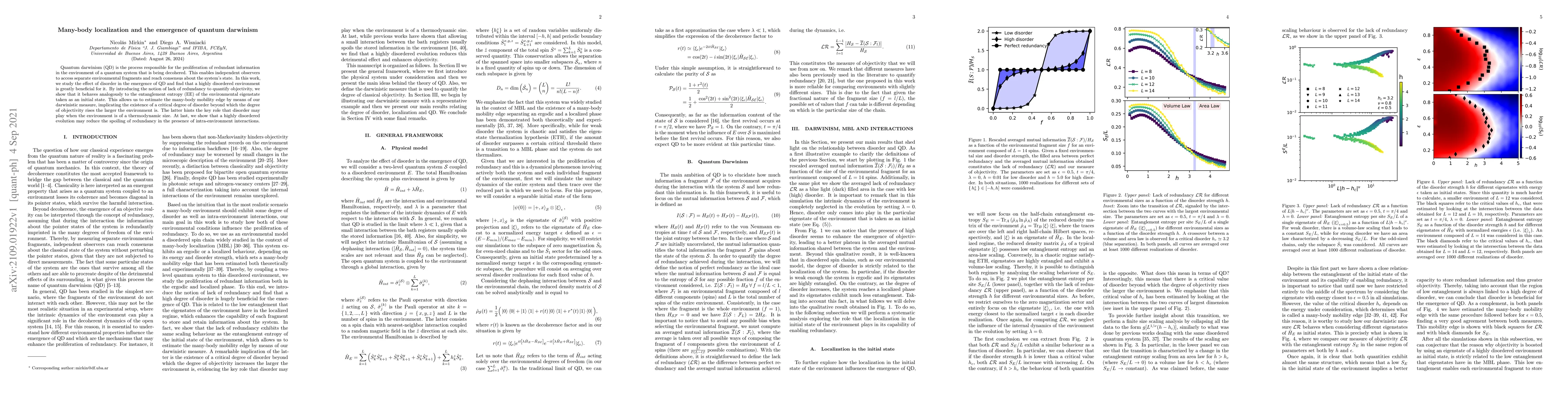 Quantum darwinism (QD) is the process responsible for the proliferation of redundant information in the environment of a quantum system that is being decohered. This enables independent observers to access separate environmental fragments and reach consensus about the system's state. In this work, we study the effect of disorder in the emergence of QD and find that a highly disordered environment is greatly beneficial for it. By introducing the notion of lack of redundancy to quantify objectivity, we show that it behaves analogously to the entanglement entropy (EE) of the environmental eigenstate taken as an initial state. This allows us to estimate the many-body mobility edge by means of our darwinistic measure, implicating the existence of a critical degree of disorder beyond which the degree of objectivity rises the larger the environment is. The latter hints the key role that disorder may play when the environment is of a thermodynamic size. At last, we show that a highly disordered evolution may reduce the spoiling of redundancy in the presence of intra-environment interactions.