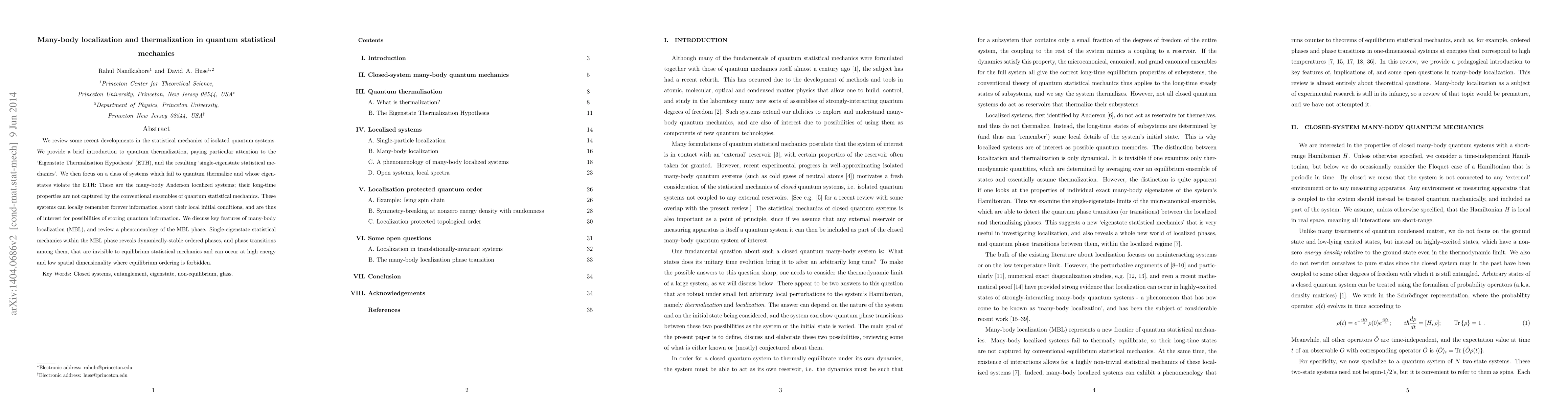 This paper reviews recent advancements in quantum statistical mechanics, focusing on many-body localization (MBL) phenomena that prevent quantum thermalization. It discusses the Eigenstate Thermalization Hypothesis (ETH) and explores how MBL systems maintain local information indefinitely, revealing non-equilibrium ordered phases and transitions that challenge conventional statistical mechanics.