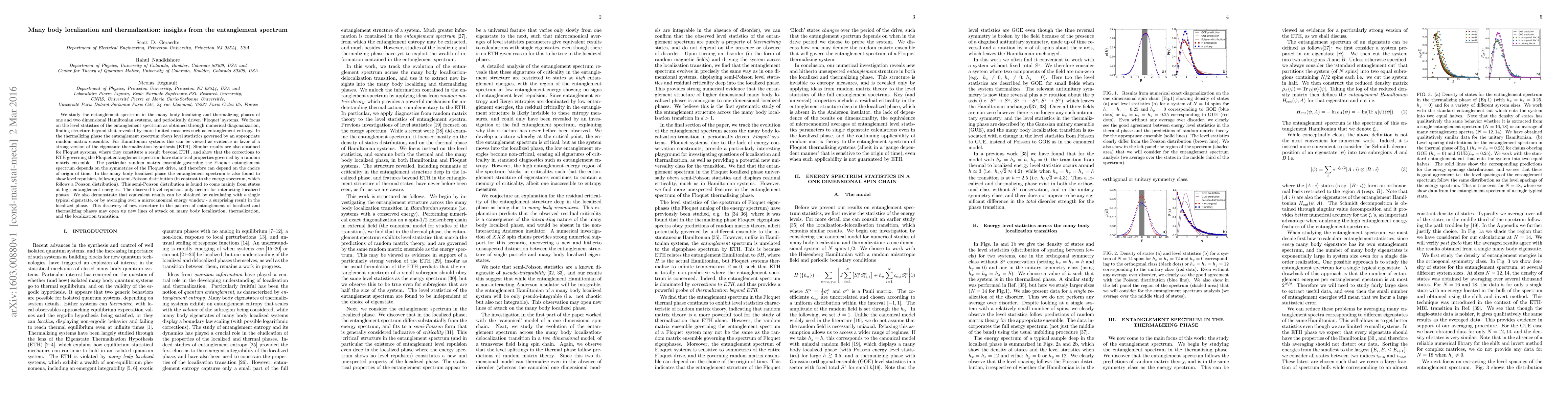 This paper explores the entanglement spectrum in localized and thermalizing many-body systems, revealing level statistics that provide deeper insights into the eigenstate thermalization hypothesis (ETH). In thermalizing phases, the entanglement spectrum follows random matrix statistics, supporting ETH, while in localized phases, it exhibits semi-Poisson distribution, indicating a distinct structure beyond simple measures.