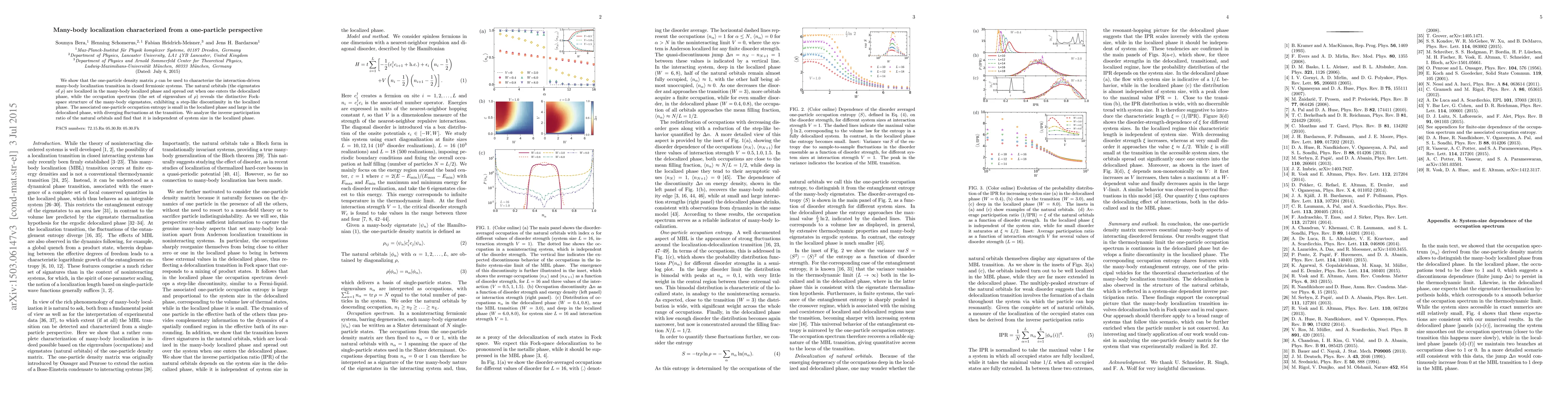 This paper demonstrates that the one-particle density matrix $\rho$ can characterize the many-body localization transition in closed fermionic systems, revealing localization through the natural orbitals and a step-like discontinuity in the occupation spectrum. The one-particle occupation entropy and fluctuations diverge at the transition, while the inverse participation ratio remains size-independent in the localized phase.