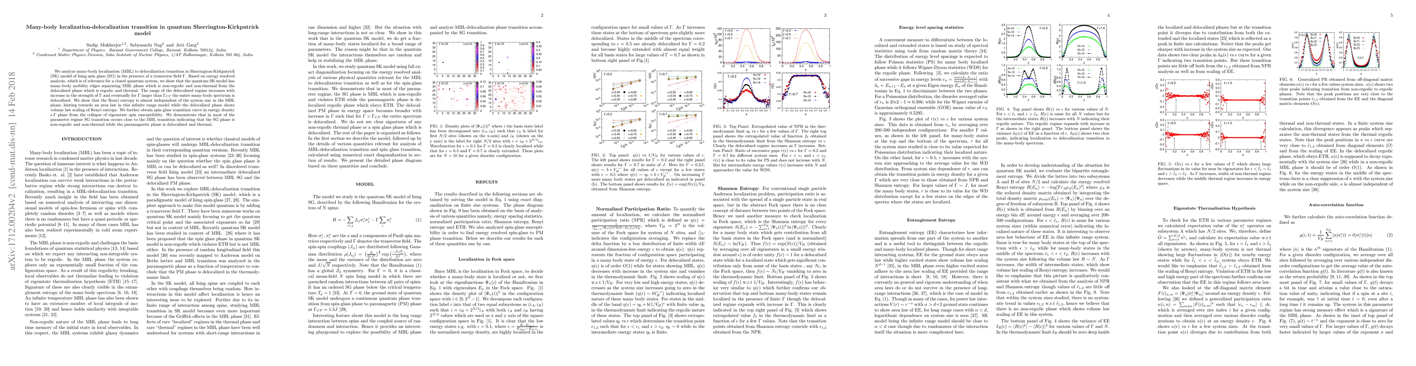 We analyze many-body localization (MBL) to delocalization transition in Sherrington-Kirkpatrick (SK) model of Ising spin glass (SG) in the presence of a transverse field $\Gamma$. Based on energy resolved analysis, which is of relevance for a closed quantum system, we show that the quantum SK model has many-body mobility edges separating MBL phase which is non-ergodic and non-thermal from the delocalized phase which is ergodic and thermal. The range of the delocalized regime increases with increase in the strength of $\Gamma$ and eventually for $\Gamma$ larger than $\Gamma_{CP}$ the entire many-body spectrum is delocalized. We show that the Renyi entropy is almost independent of the system size in the MBL phase, hinting towards an area law in this infinite range model while the delocalized phase shows volume law scaling of Renyi entropy. We further obtain spin glass transition curve in energy density $\epsilon$-$\Gamma$ plane from the collapse of eigenstate spin susceptibility. We demonstrate that in most of the parameter regime SG transition occurs close to the MBL transition indicating that the SG phase is non-ergodic and non-thermal while the paramagnetic phase is delocalized and thermal.