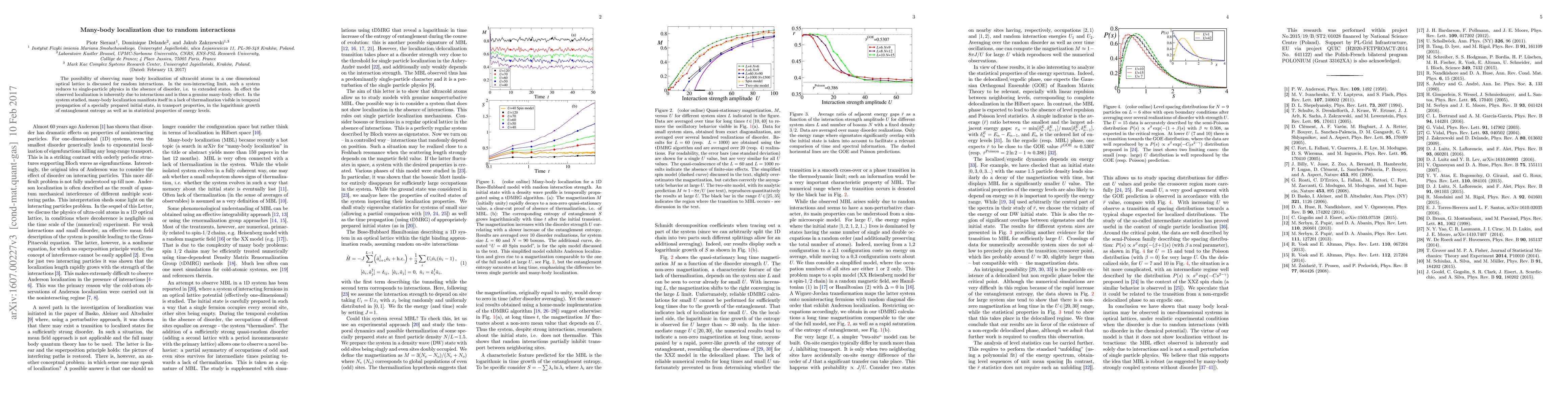This paper explores many-body localization in ultracold atoms within a one-dimensional optical lattice featuring random interactions, revealing localization as a genuine many-body effect distinct from single-particle physics. The study observes non-thermalization, altered transport, and logarithmic entanglement entropy growth due to these interactions.
