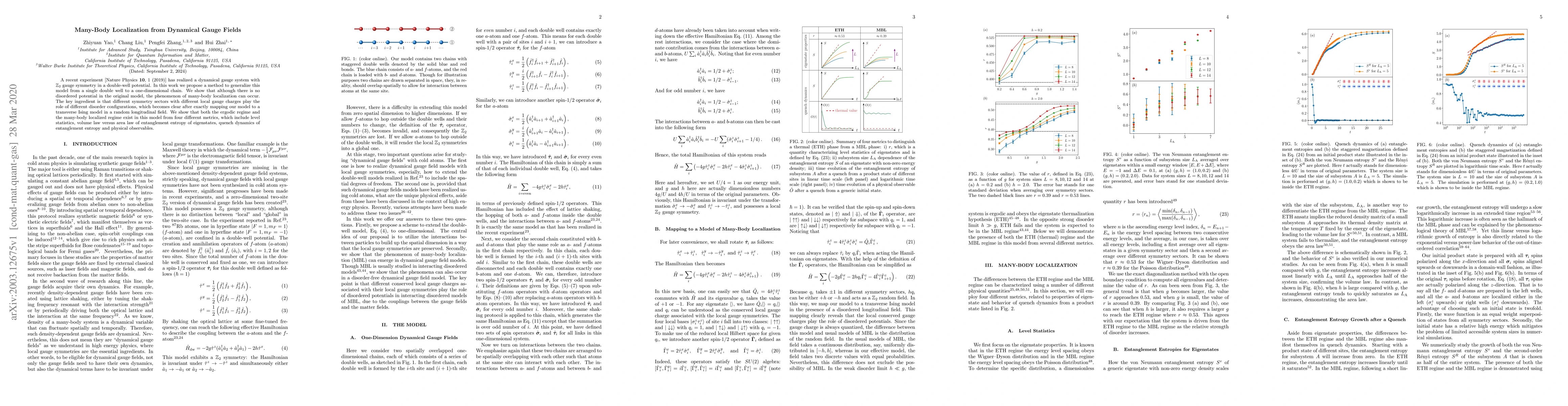 A recent experiment [Nature Physics 10, 1 (2019)] has realized a dynamical gauge system with $\mathbb{Z}_2$ gauge symmetry in a double-well potential. In this work we propose a method to generalize this model from a single double well to a one-dimensional chain. We show that although there is no disordered potential in the original model, the phenomenon of many-body localization can occur. The key ingredient is that different symmetry sectors with different local gauge charges play the role of different disorder configurations, which becomes clear after exactly mapping our model to a transverse Ising model in a random longitudinal field. We show that both the ergodic regime and the many-body localized regime exist in this model from four different metrics, which include level statistics, volume law versus area law of entanglement entropy of eigenstates, quench dynamics of entanglement entropy and physical observables.