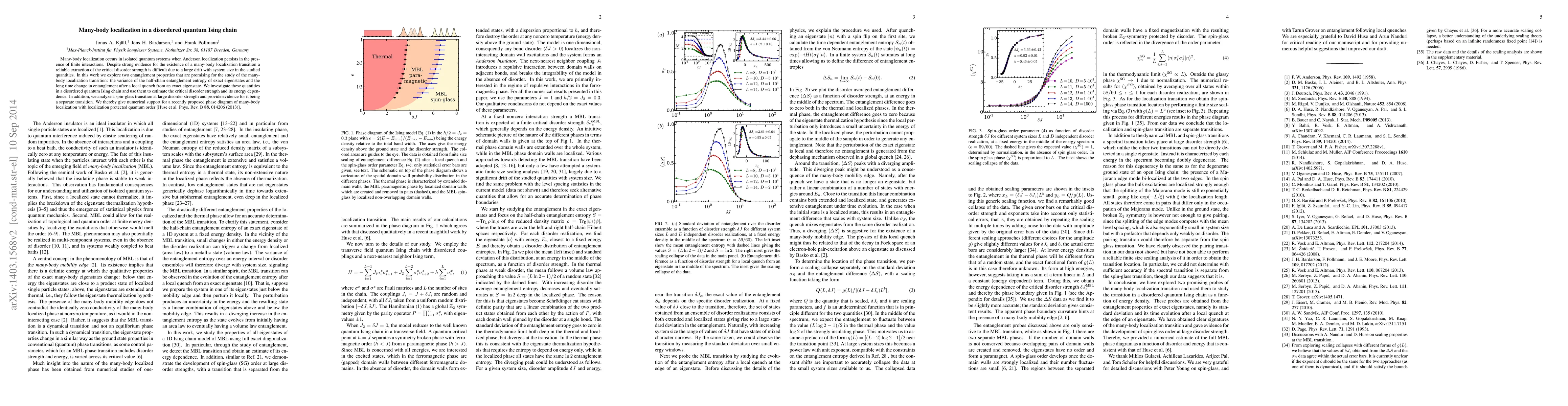 This paper investigates many-body localization in a disordered quantum Ising chain by analyzing entanglement properties, estimating the critical disorder strength, and demonstrating a separate spin-glass transition at large disorder levels, supporting a proposed phase diagram for many-body localization.
