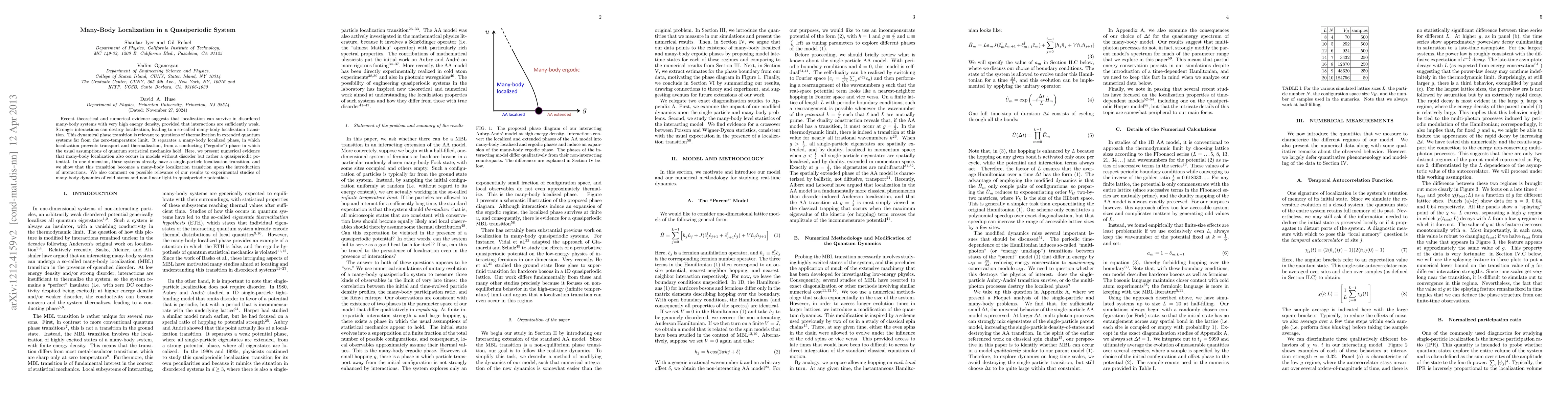 This paper provides numerical evidence that many-body localization, which prevents transport and thermalization, can occur in quasiperiodic systems even without disorder, marking a transition to a conducting phase when interactions are introduced. The findings have implications for studying many-body dynamics in cold atoms and non-linear light systems.