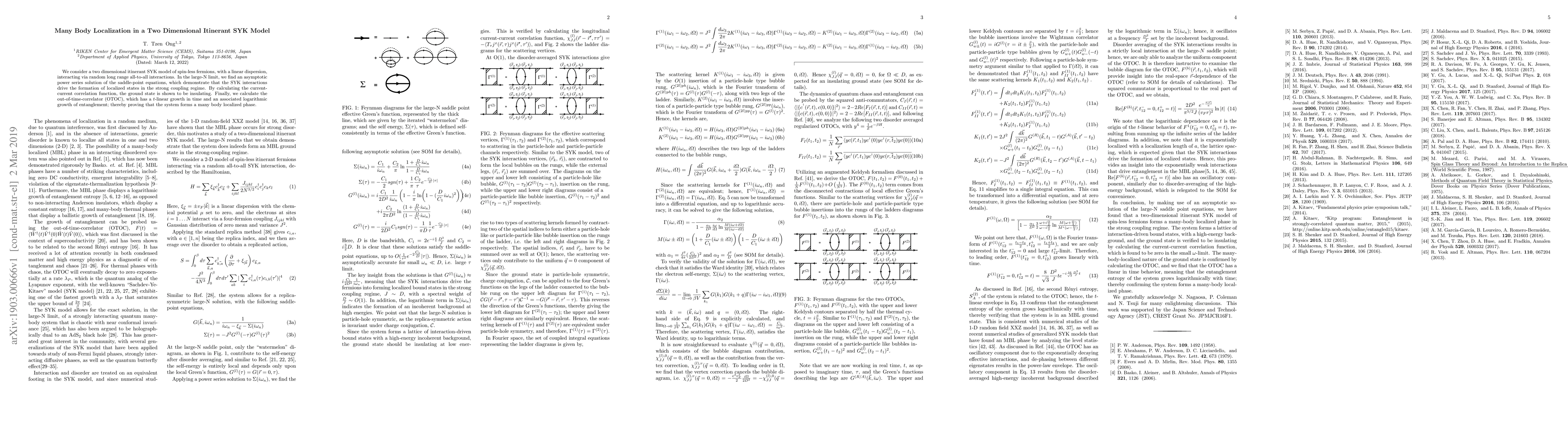 The paper presents an asymptotic power series solution for the saddle-point equations in a two-dimensional itinerant SYK model, demonstrating the formation of localized states and an insulating ground state, and proving many-body localization through OTOC analysis.