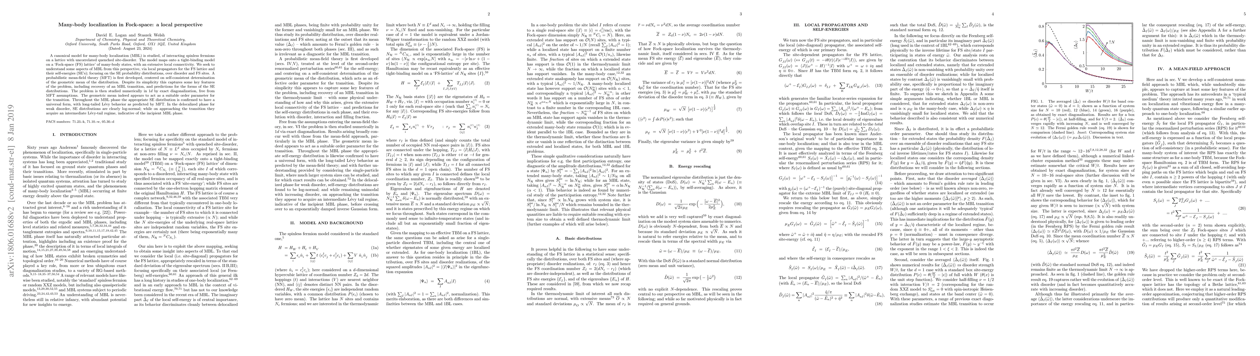 This paper investigates many-body localization (MBL) in a canonical model of interacting spinless fermions on a lattice using a Fock-space perspective. It develops a probabilistic mean-field theory centered on the geometric mean of self-energy distribution, predicting MBL transition and universal SE distribution forms. Numerical exact diagonalization in 1D confirms these predictions, showing a long-tailed L\'evy behavior in the MBL phase and log-normal to L\'evy transition in SE distributions near the MBL transition.