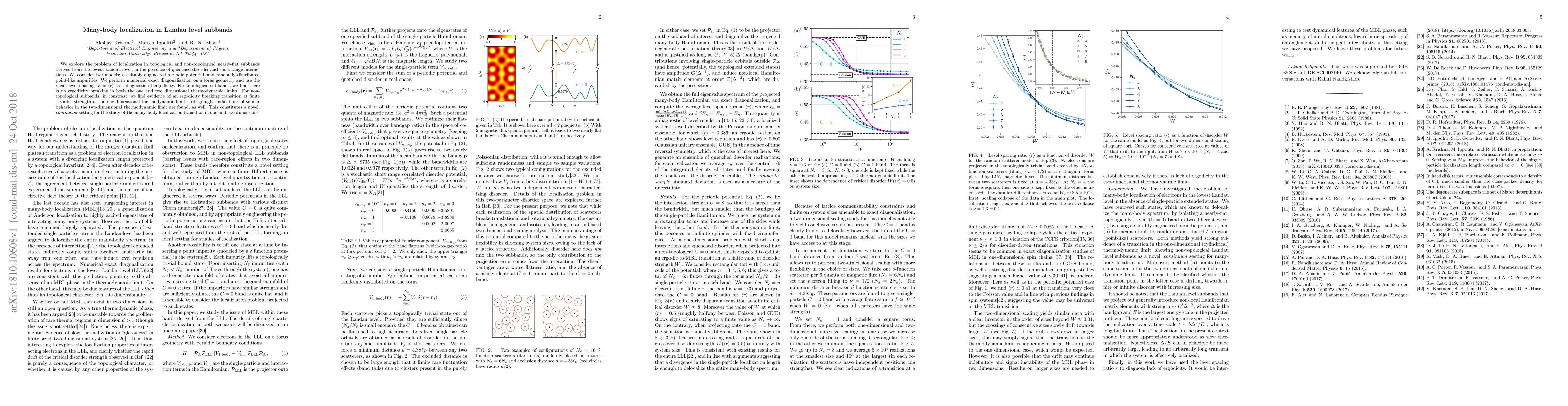 We explore the problem of localization in topological and non-topological nearly-flat subbands derived from the lowest Landau level, in the presence of quenched disorder and short-range interactions. We consider two models: a suitably engineered periodic potential, and randomly distributed point-like impurities. We perform numerical exact diagonalization on a torus geometry and use the mean level spacing ratio $\langle r \rangle$ as a diagnostic of ergodicity. For topological subbands, we find there is no ergodicity breaking in both the one and two dimensional thermodynamic limits. For non-topological subbands, in constrast, we find evidence of an ergodicity breaking transition at finite disorder strength in the one-dimensional thermodynamic limit. Intriguingly, indications of similar behavior in the two-dimensional thermodynamic limit are found, as well. This constitutes a novel, $\textit{continuum}$ setting for the study of the many-body localization transition in one and two dimensions.