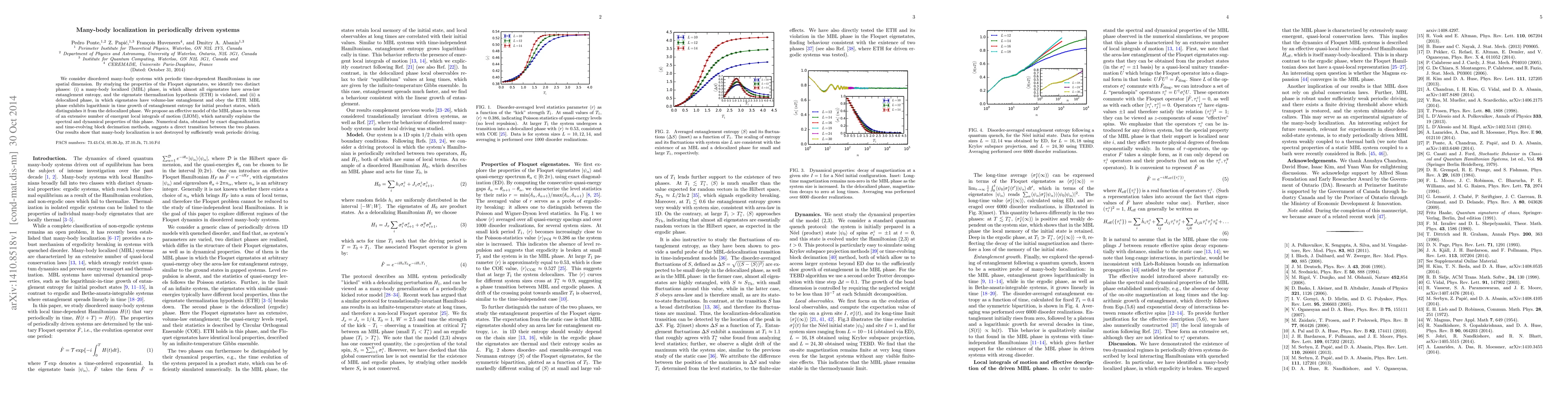 This paper investigates disordered many-body systems with periodically driven Hamiltonians, identifying two phases: a many-body localized phase with area-law entanglement and violated ETH, and a delocalized phase with volume-law entanglement and obeying ETH. The study proposes an effective model explaining MBL phase dynamics through emergent local integrals of motion.