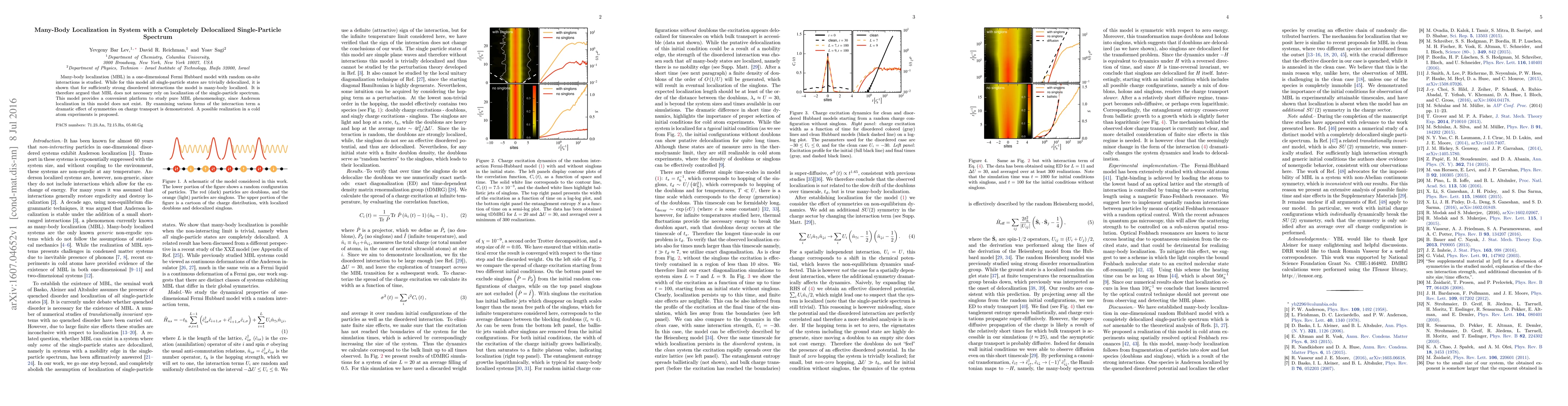 This paper investigates many-body localization (MBL) in a one-dimensional Fermi Hubbard model with random interactions, showing that strong disorder can induce MBL despite a completely delocalized single-particle spectrum. The study highlights the role of symmetries in charge transport and proposes a cold atom experiment to realize this phenomenon.