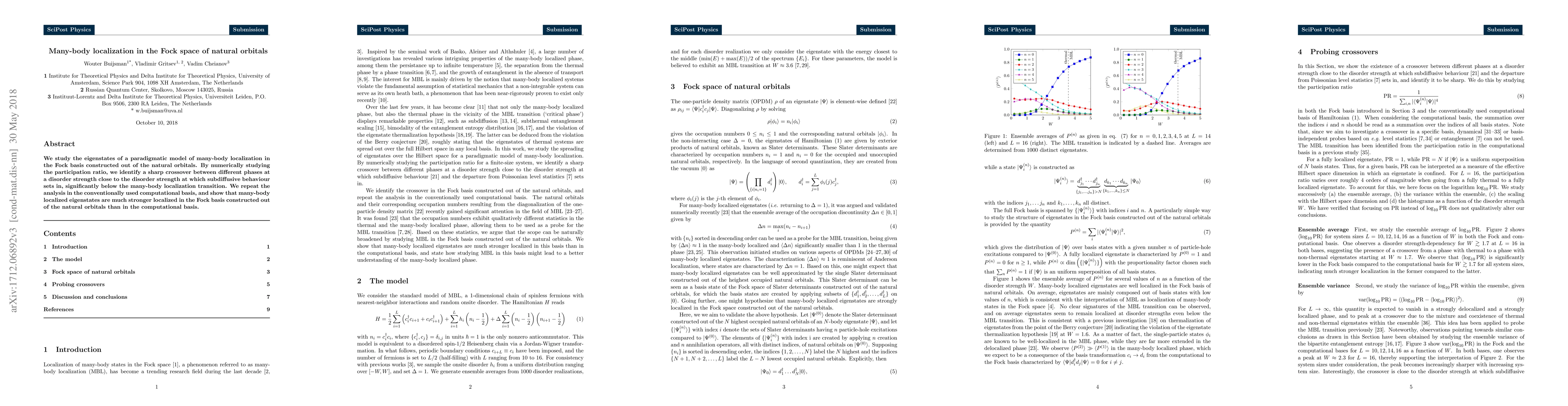 This research investigates many-body localization in a paradigmatic model using the Fock space of natural orbitals, revealing a sharp phase crossover linked to subdiffusive behavior. It demonstrates that localized eigenstates exhibit stronger localization in the Fock basis based on natural orbitals compared to the conventional computational basis.