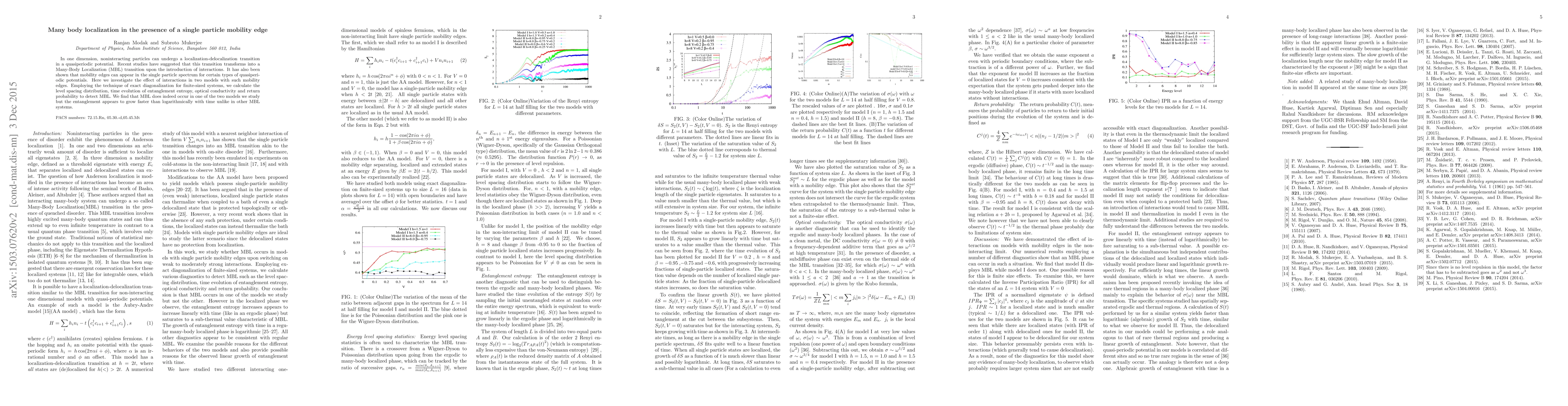 This paper investigates many-body localization (MBL) in one-dimensional systems with quasiperiodic potentials and mobility edges, finding MBL in one model but unusual entanglement growth in time. The study uses exact diagonalization to analyze level spacing, entanglement entropy, optical conductivity, and return probability.