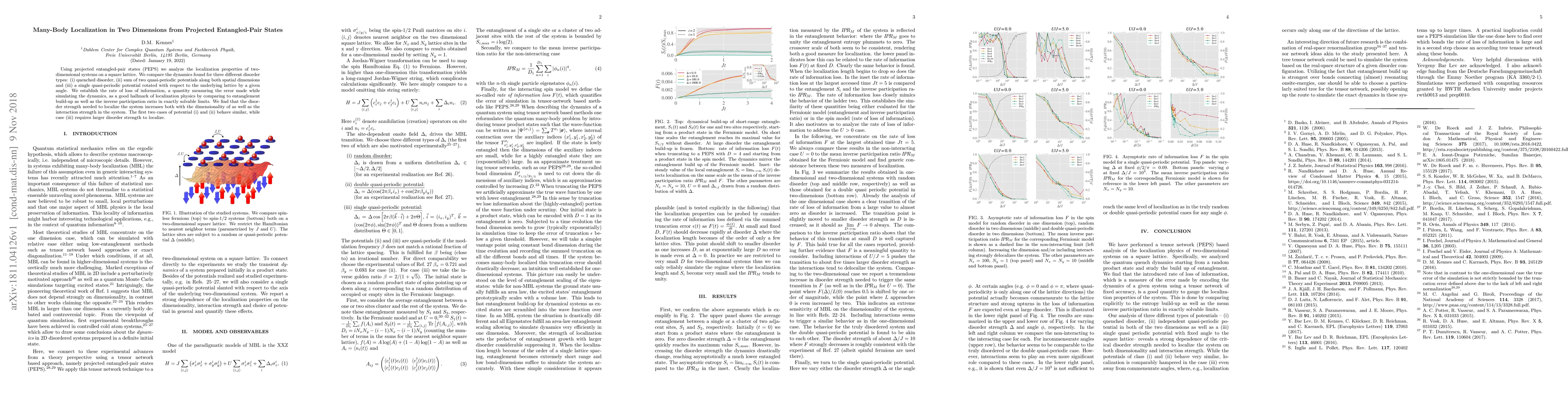 Using projected entangled-pair states (PEPS) we analyze the localization properties of two-dimensional systems on a square lattice. We compare the dynamics found for three different disorder types: (i) quenched disorder, (ii) sum of two quasi-periodic potentials along both spatial dimensions and (iii) a single quasi-periodic potential rotated with respect to the underlying lattice by a given angle. We establish the rate of loss of information, a quantity measuring the error made while simulating the dynamics, as a good hallmark of localization physics by comparing to entanglement build-up as well as the inverse participation ratio in exactly solvable limits. We find that the disorder strength needed to localize the system increases both with the dimensionality of as well as the interaction strength in the system. The first two cases of potential (i) and (ii) behave similar, while case (iii) requires larger disorder strength to localize.