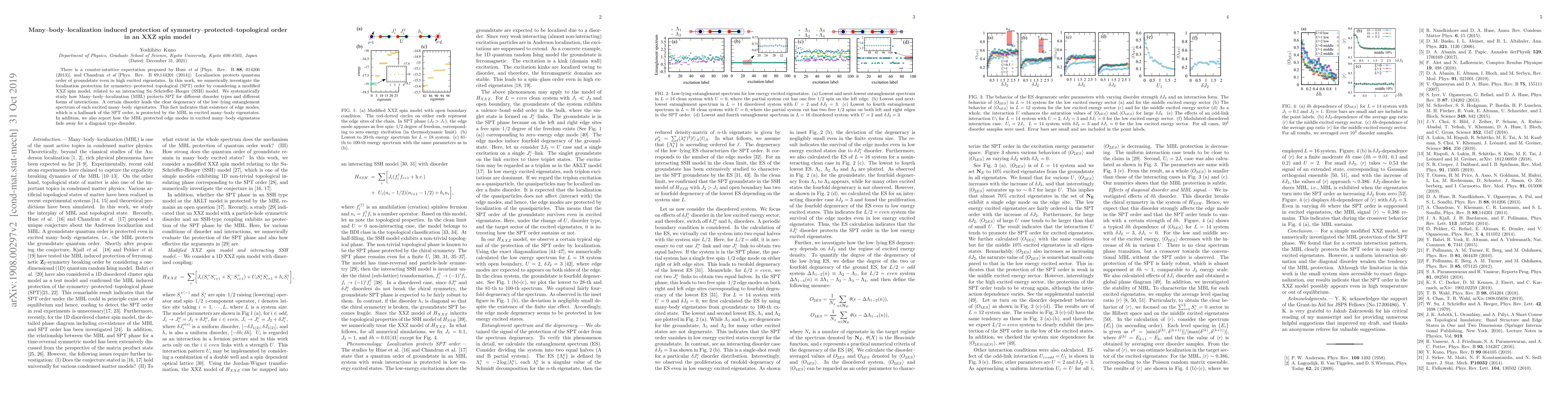 This paper investigates how Many-body-localization (MBL) protects symmetry-protected topological (SPT) order in a modified XXZ spin model. It finds that MBL preserves edge modes in excited eigenstates, indicating SPT protection, but this effect diminishes with diagonal disorder.