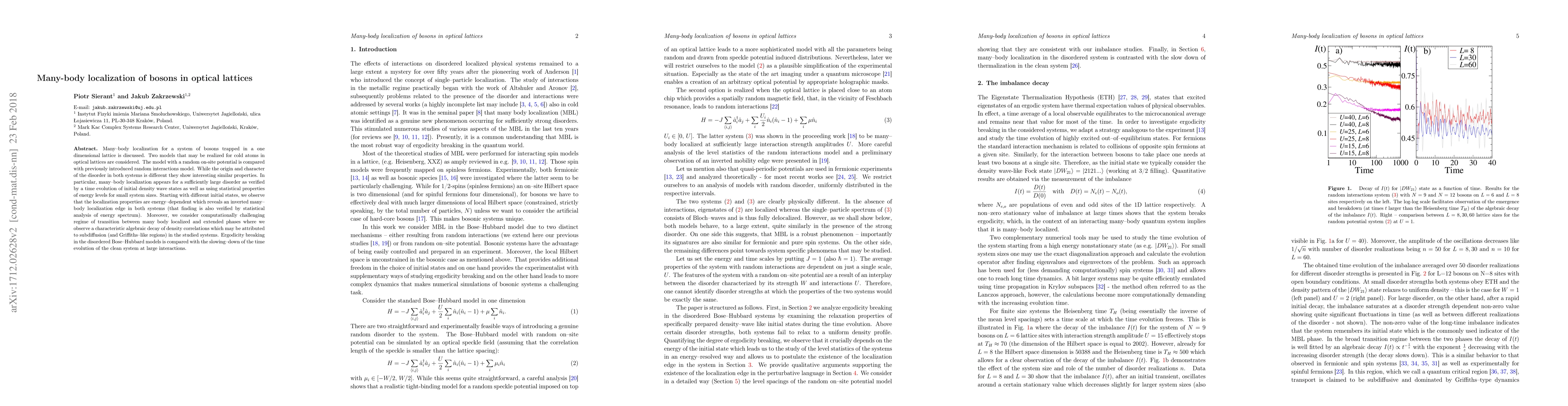 This paper explores many-body localization in systems of bosons in optical lattices, comparing two models with different disorder origins. Both models exhibit many-body localization at large disorder, characterized by an inverted localization edge and an algebraic decay of density correlations, indicating subdiffusion and Griffiths effects.