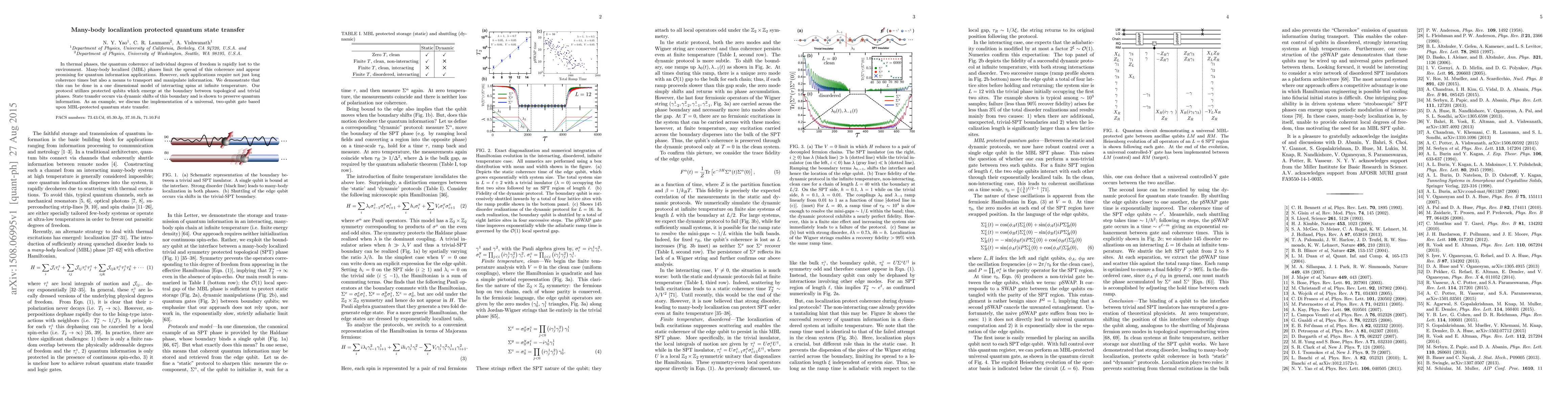 In thermal phases, the quantum coherence of individual degrees of freedom is rapidly lost to the environment. Many-body localized (MBL) phases limit the spread of this coherence and appear promising for quantum information applications. However, such applications require not just long coherence times but also a means to transport and manipulate information. We demonstrate that this can be done in a one dimensional model of interacting spins at infinite temperature. Our protocol utilizes protected qubits which emerge at the boundary between topological and trivial phases. State transfer occurs via dynamic shifts of this boundary and is shown to preserve quantum information. As an example, we discuss the implementation of a universal, two-qubit gate based upon MBL-protected quantum state transfer.
