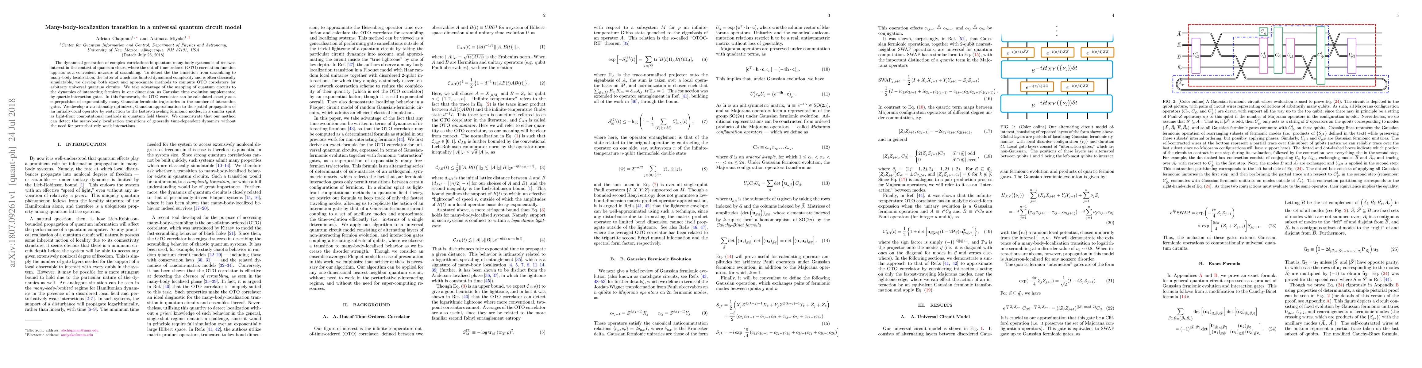 The dynamical generation of complex correlations in quantum many-body systems is of renewed interest in the context of quantum chaos, where the out-of-time-ordered (OTO) correlation function appears as a convenient measure of scrambling. To detect the the transition from scrambling to many-body localization, the latter of which has limited dynamical complexity and is often classically simulatable, we develop both exact and approximate methods to compute OTO correlators for arbitrary universal quantum circuits. We take advantage of the mapping of quantum circuits to the dynamics of interacting fermions in one dimension, as Gaussian time evolution supplemented by quartic interaction gates. In this framework, the OTO correlator can be calculated exactly as a superposition of exponentially many Gaussian-fermionic trajectories in the number of interaction gates. We develop a variationally-optimized, Gaussian approximation to the spatial propagation of an initially-local operator by restriction to the fastest-traveling fermionic modes, in a similar spirit as light-front computational methods in quantum field theory. We demonstrate that our method can detect the many-body localization transitions of generally time-dependent dynamics without the need for perturbatively weak interactions.