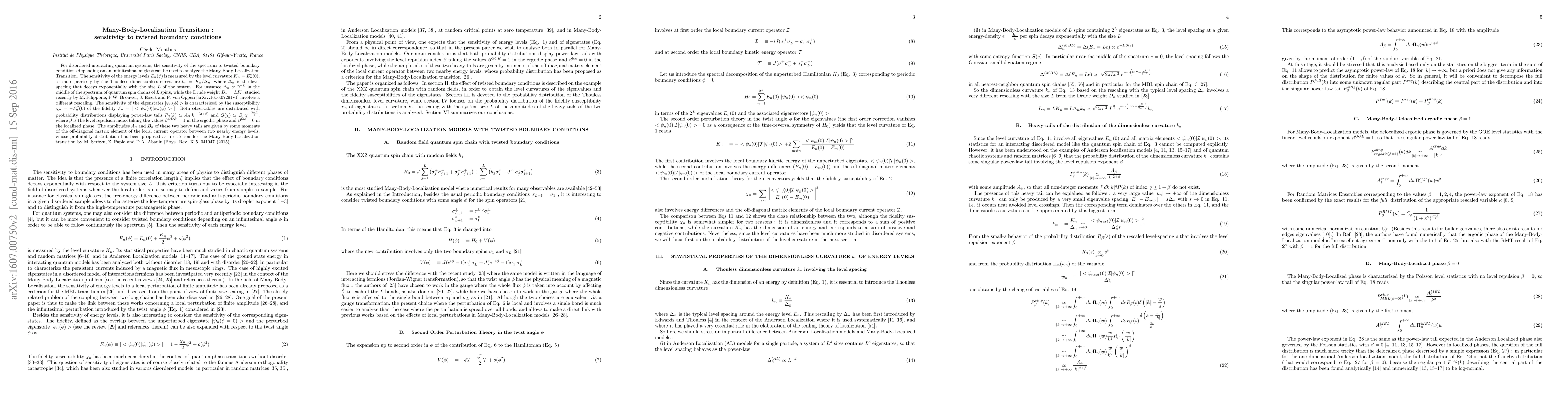 This paper examines the Many-Body-Localization (MBL) transition in disordered quantum systems through the sensitivity of energy levels to twisted boundary conditions. It uses level curvature and Thouless curvature to analyze the spectrum's sensitivity, finding that power-law distributions characterize the transition, with different exponents in the ergodic and localized phases.