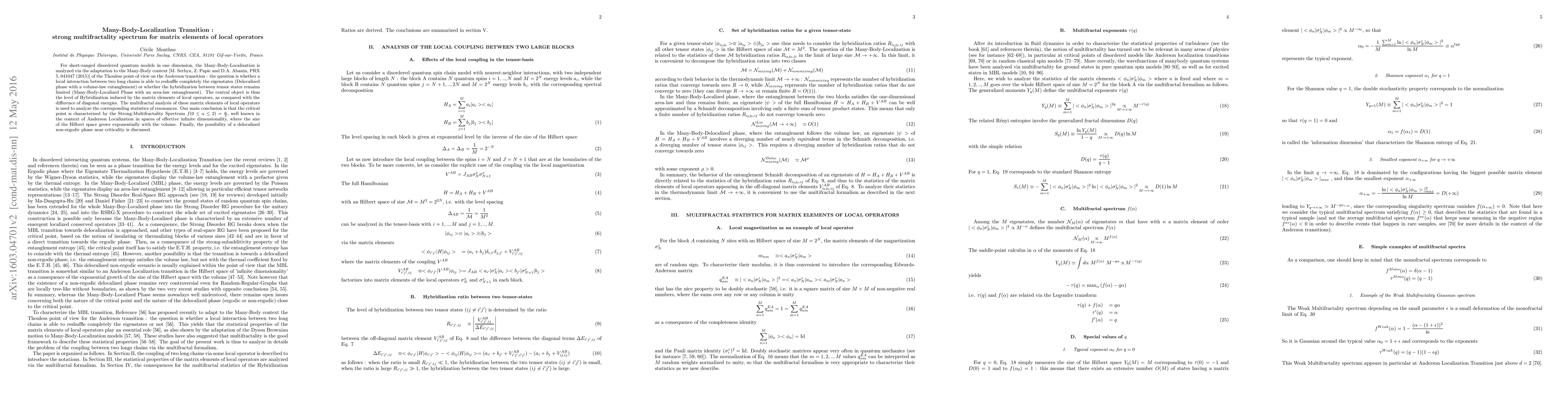 This paper investigates the Many-Body-Localization transition in one-dimensional disordered quantum systems, focusing on the multifractality spectrum of matrix elements of local operators. The study concludes that the critical point exhibits a strong-multifractality spectrum, similar to Anderson localization, suggesting the potential existence of a delocalized non-ergodic phase near the transition.