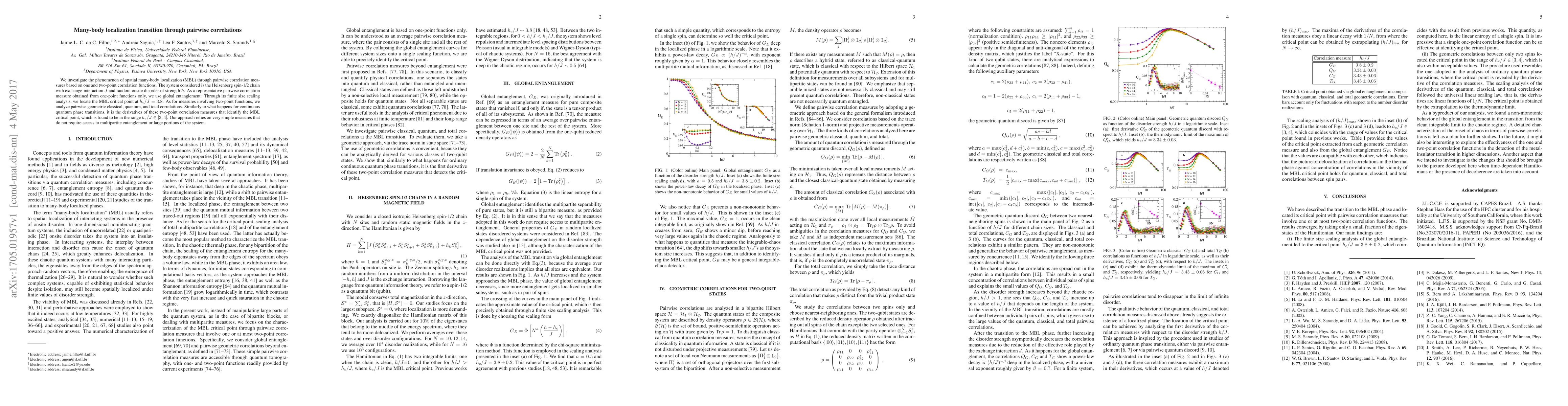 We investigate the phenomenon of spatial many-body localization (MBL) through pairwise correlation measures based on one and two-point correlation functions. The system considered is the Heisenberg spin-1/2 chain with exchange interaction $J$ and random onsite disorder of strength $h$. As a representative pairwise correlation measure obtained from one-point functions only, we use global entanglement. Through its finite size scaling analysis, we locate the MBL critical point at $h_{c}/J = 3.8$. As for measures involving two-point functions, we analyze pairwise geometric classical, quantum, and total correlations. Similarly to what happens for continuous quantum phase transitions, it is the derivatives of these two-point correlation measures that identify the MBL critical point, which is found to be in the range $h_{c}/J \in \left[3,4\right]$. Our approach relies on very simple measures that do not require access to multipartite entanglement or large portions of the system.