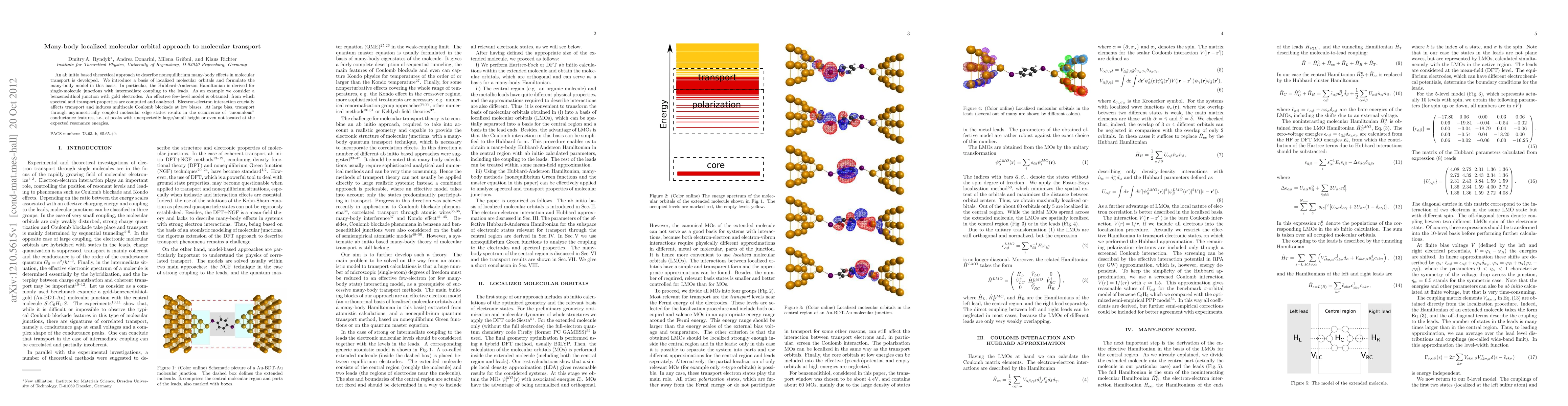 An ab initio based theoretical approach to describe nonequilibrium many-body effects in molecular transport is developed. We introduce a basis of localized molecular orbitals and formulate the many-body model in this basis. In particular, the Hubbard-Anderson Hamiltonian is derived for single-molecule junctions with intermediate coupling to the leads. As an example we consider a benzenedithiol junction with gold electrodes. An effective few-level model is obtained, from which spectral and transport properties are computed and analyzed. Electron-electron interaction crucially affects transport and induces multiscale Coulomb blockade at low biases. At large bias, transport through asymmetrically coupled molecular edge states results in the occurrence of "anomalous" conductance features, i.e., of peaks with unexpectedly large/small height or even not located at the expected resonance energies.