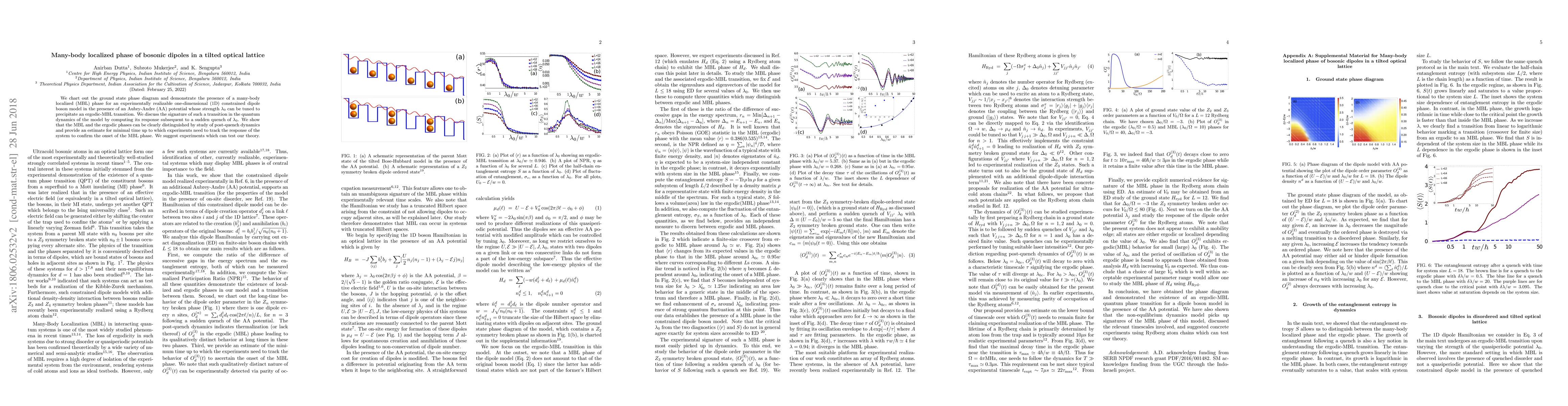 We chart out the ground state phase diagram and demonstrate the presence of a many-body localized (MBL) phase for an experimentally realizable one-dimensional (1D) constrained dipole boson model in the presence of an Aubry-Andre (AA) potential whose strength $\lambda_0$ can be tuned to precipitate an ergodic-MBL transition. We discuss the signature of such a transition in the quantum dynamics of the model by computing its response subsequent to a sudden quench of $\lambda_0$. We show that the MBL and the ergodic phases can be clearly distinguished by study of post-quench dynamics and provide an estimate for minimal time up to which experiments need to track the response of the system to confirm the onset of the MBL phase. We suggest experiments which can test our theory.