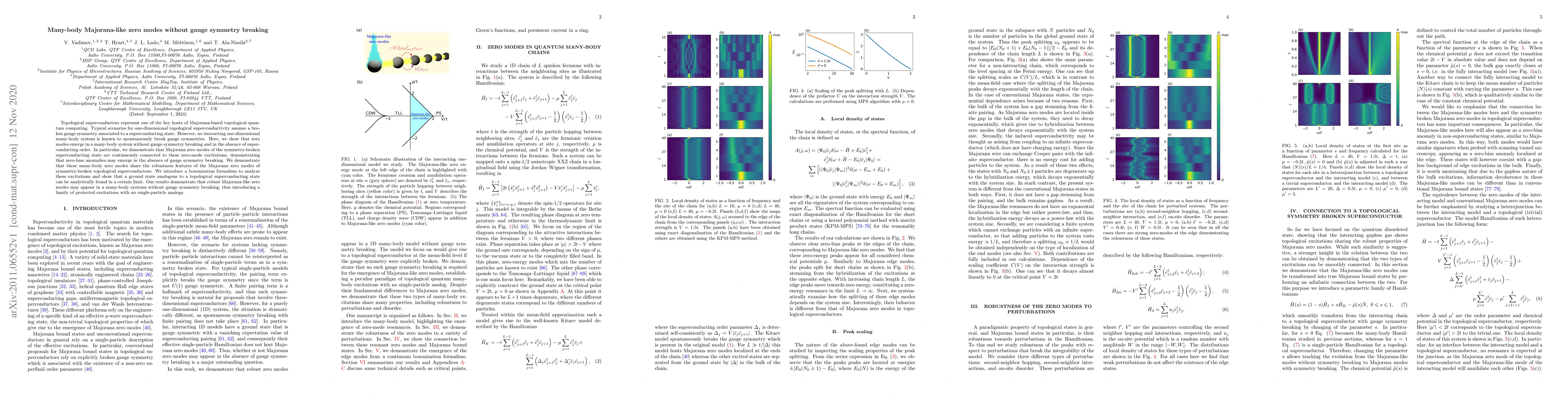 This paper demonstrates the emergence of many-body Majorana-like zero modes in topological superconductors without gauge symmetry breaking, highlighting the robustness of these excitations and introducing a bosonization framework to analyze them. The findings suggest a new class of protected excitations that arise without conventional superconducting order.