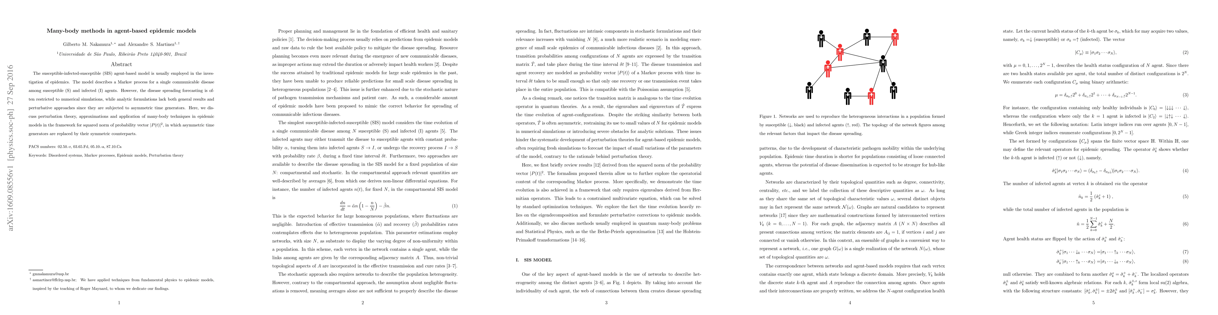 The susceptible-infected-susceptible (SIS) agent-based model is usually employed in the investigation of epidemics. The model describes a Markov process for a single communicable disease among susceptible (S) and infected (I) agents. However, the disease spreading forecasting is often restricted to numerical simulations, while analytic formulations lack both general results and perturbative approaches since they are subjected to asymmetric time generators. Here, we discuss perturbation theory, approximations and application of many-body techniques in epidemic models in the framework for squared norm of probability vector $|P(t)| ^2$, in which asymmetric time generators are replaced by their symmetric counterparts.