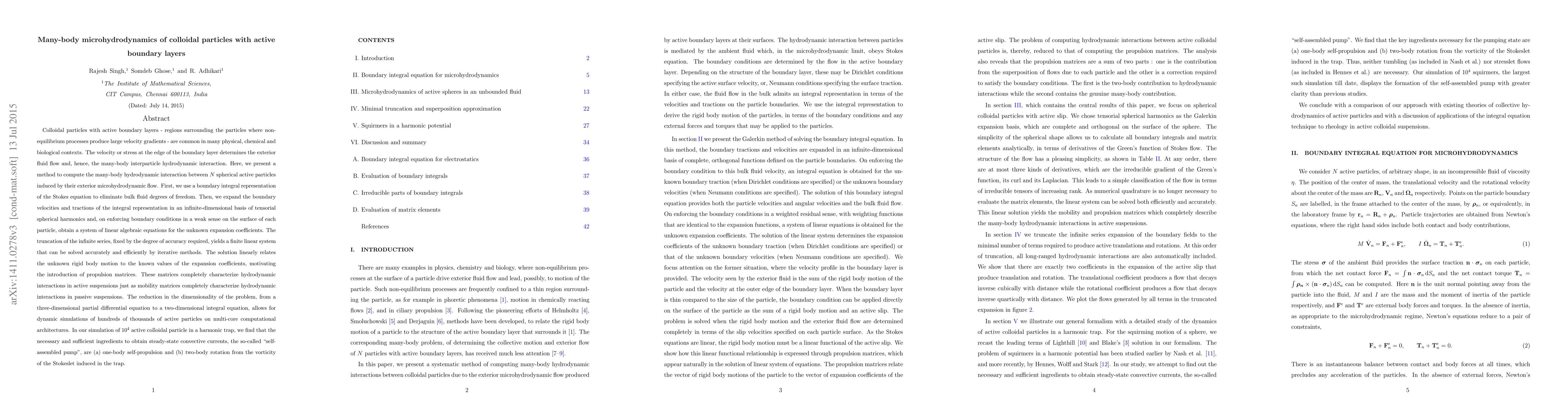 This paper develops a method to compute the many-body hydrodynamic interactions between colloidal particles with active boundary layers, using a boundary integral representation of the Stokes equation. The approach reduces the problem from a three-dimensional PDE to a two-dimensional integral equation, enabling efficient simulations of large systems of active particles.