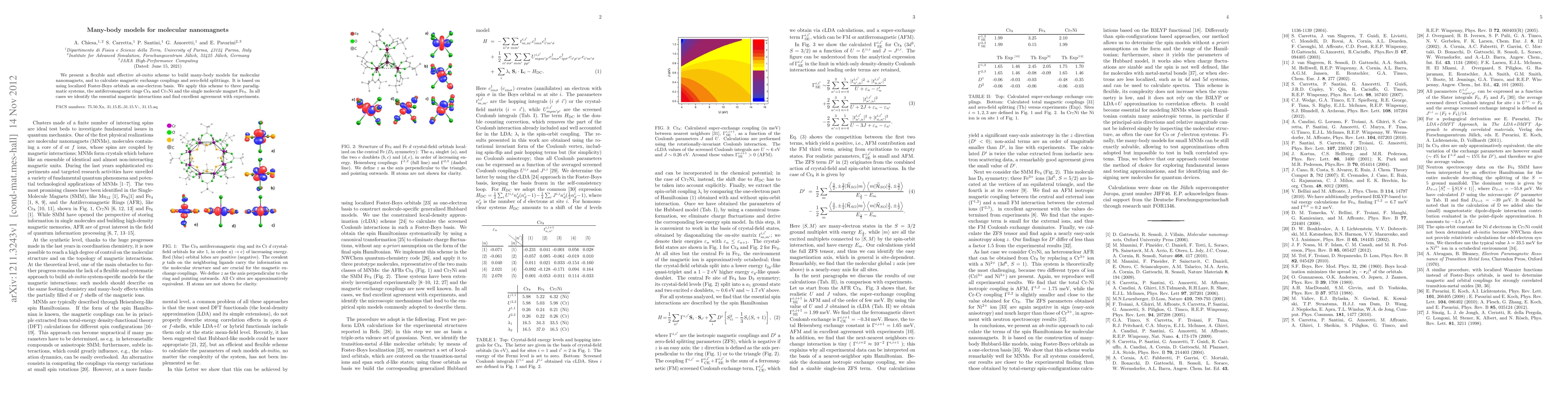 This paper introduces an ab-initio method for constructing many-body models of molecular nanomagnets, using localized Foster-Boys orbitals. The model successfully calculates magnetic exchange couplings and zero-field splittings, demonstrating agreement with experimental data for Cr8, Cr7Ni, and Fe4 systems.