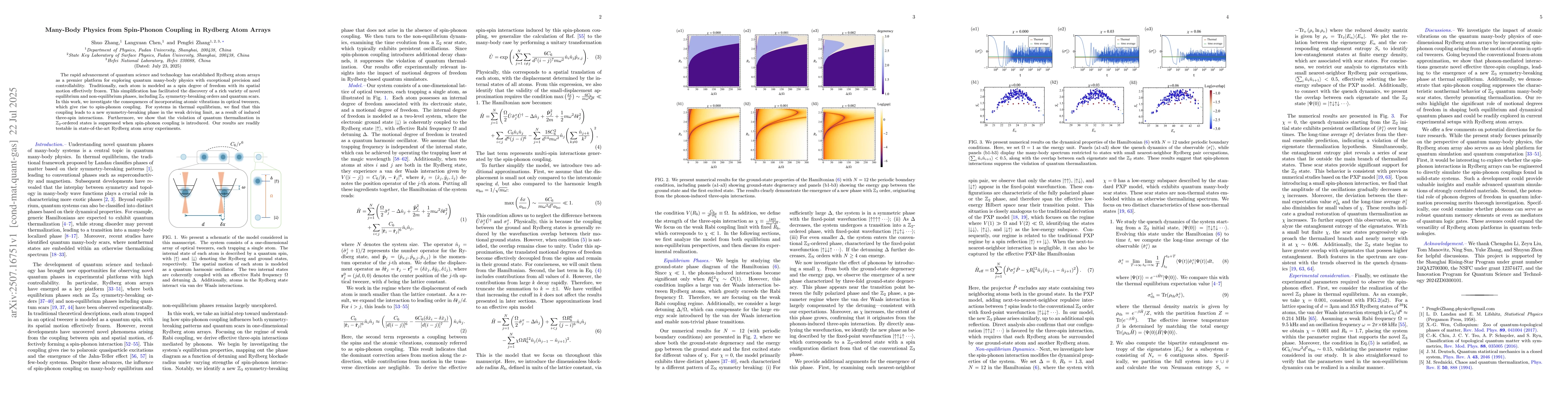The rapid advancement of quantum science and technology has established Rydberg atom arrays as a premier platform for exploring quantum many-body physics with exceptional precision and controllability. Traditionally, each atom is modeled as a spin degree of freedom with its spatial motion effectively frozen. This simplification has facilitated the discovery of a rich variety of novel equilibrium and non-equilibrium phases, including $\mathbb{Z}_{\text{N}}$ symmetry-breaking orders and quantum scars. In this work, we investigate the consequences of incorporating atomic vibrations in optical tweezers, which give rise to spin-phonon coupling. For systems in thermal equilibrium, we find that this coupling leads to a new symmetry-breaking phase in the weak driving limit, as a result of induced three-spin interactions. Furthermore, we show that the violation of quantum thermalization in $\mathbb{Z}_2$-ordered states is suppressed when spin-phonon coupling is introduced. Our results are readily testable in state-of-the-art Rydberg atom array experiments.