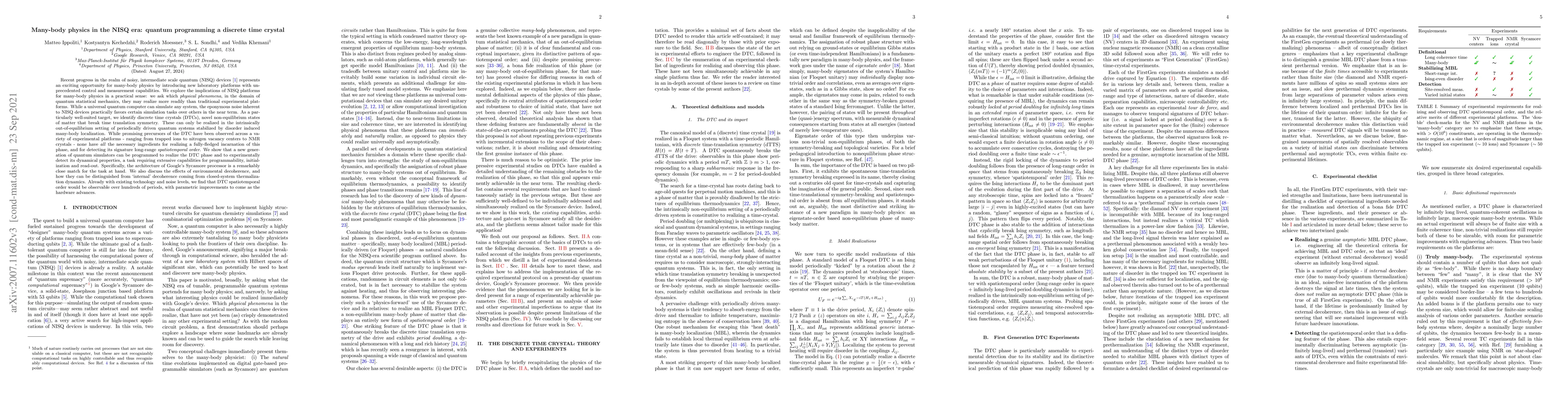 Recent progress in the realm of noisy, intermediate scale quantum (NISQ) devices represents an exciting opportunity for many-body physics, by introducing new laboratory platforms with unprecedented control and measurement capabilities. We explore the implications of NISQ platforms for many-body physics in a practical sense: we ask which {\it physical phenomena}, in the domain of quantum statistical mechanics, they may realize more readily than traditional experimental platforms. As a particularly well-suited target, we identify discrete time crystals (DTCs), novel non-equilibrium states of matter that break time translation symmetry. These can only be realized in the intrinsically out-of-equilibrium setting of periodically driven quantum systems stabilized by disorder induced many-body localization. While precursors of the DTC have been observed across a variety of experimental platforms - ranging from trapped ions to nitrogen vacancy centers to NMR crystals - none have \emph{all} the necessary ingredients for realizing a fully-fledged incarnation of this phase, and for detecting its signature long-range \emph{spatiotemporal order}. We show that a new generation of quantum simulators can be programmed to realize the DTC phase and to experimentally detect its dynamical properties, a task requiring extensive capabilities for programmability, initialization and read-out. Specifically, the architecture of Google's Sycamore processor is a remarkably close match for the task at hand. We also discuss the effects of environmental decoherence, and how they can be distinguished from `internal' decoherence coming from closed-system thermalization dynamics. Already with existing technology and noise levels, we find that DTC spatiotemporal order would be observable over hundreds of periods, with parametric improvements to come as the hardware advances.