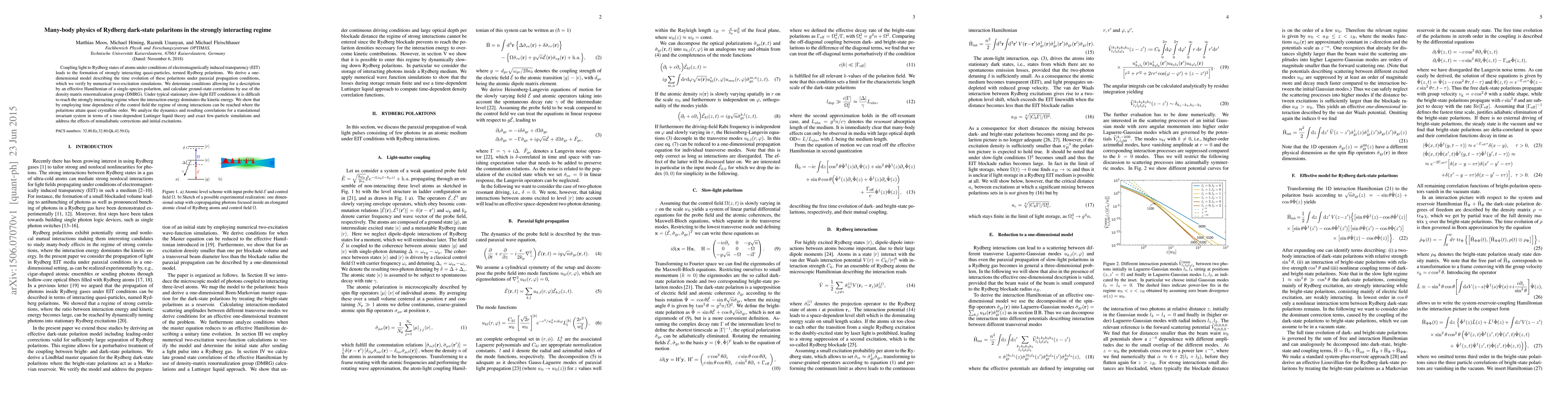 This paper investigates the many-body physics of Rydberg dark-state polaritons formed under electromagnetically induced transparency, deriving a one-dimensional model for their time evolution. The authors demonstrate how strong interactions can be achieved through time-dependent control fields, leading to quasi-crystalline order and analyzing the dynamics using a time-dependent Luttinger liquid theory.