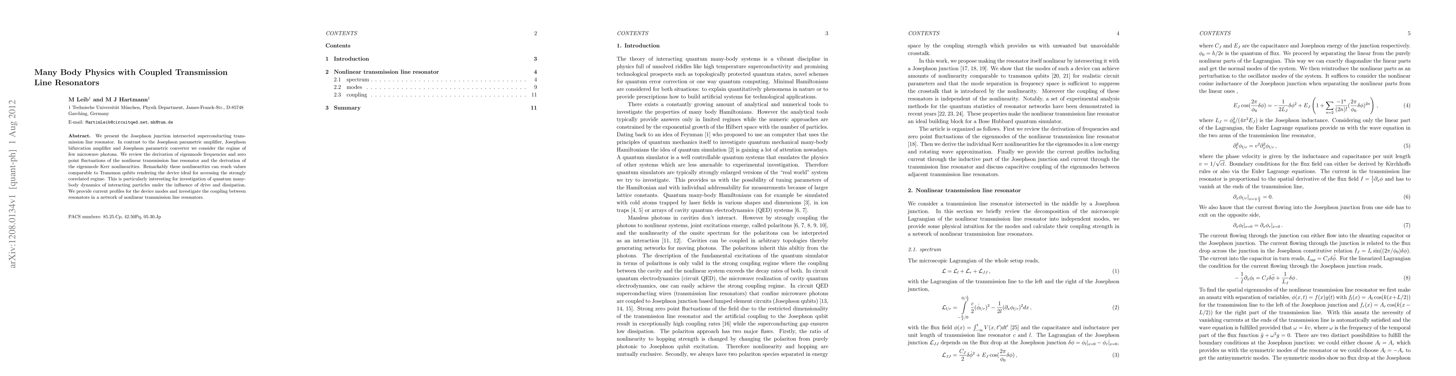 We present the Josephson junction intersected superconducting transmission line resonator. In contrast to the Josephson parametric amplifier, Josephson bifurcation amplifier and Josephson parametric converter we consider the regime of few microwave photons. We review the derivation of eigenmode frequencies and zero point fluctuations of the nonlinear transmission line resonator and the derivation of the eigenmode Kerr nonlinearities. Remarkably these nonlinearities can reach values comparable to Transmon qubits rendering the device ideal for accessing the strongly correlated regime. This is particularly interesting for investigation of quantum many-body dynamics of interacting particles under the influence of drive and dissipation. We provide current profiles for the device modes and investigate the coupling between resonators in a network of nonlinear transmission line resonators.