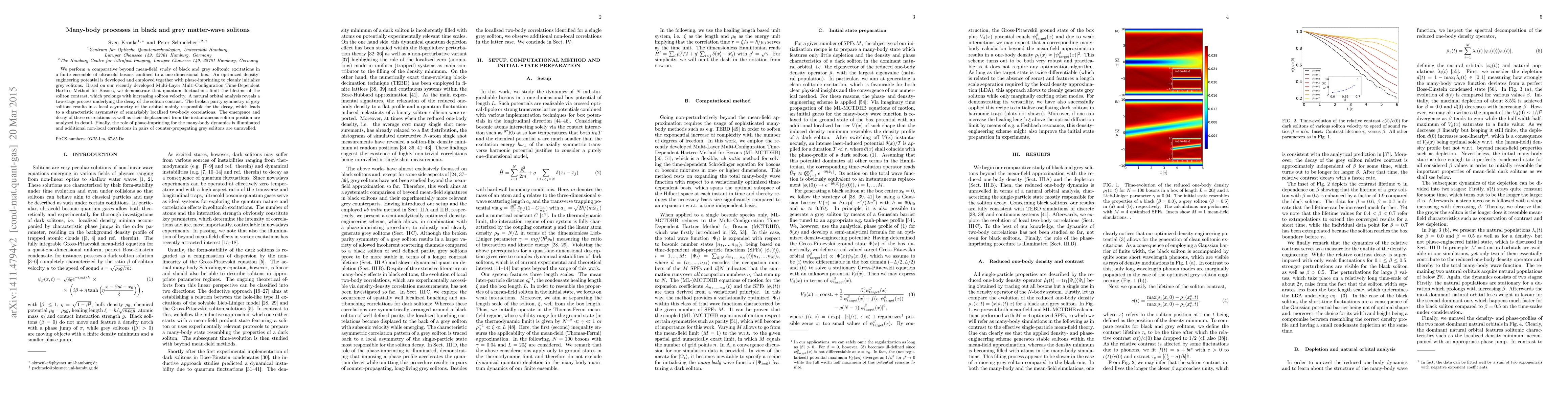 We perform a comparative beyond mean-field study of black and grey solitonic excitations in a finite ensemble of ultracold bosons confined to a one-dimensional box. An optimized density-engineering potential is developed and employed together with phase-imprinting to cleanly initialize grey solitons. Based on our recently developed Multi-Layer Multi-Configuration Time-Dependent Hartree Method for Bosons, we demonstrate an enhancement of the quantum fluctuations limited lifetime of the soliton contrast with increasing soliton velocity. A natural orbital analysis reveals a two-stage process underlying the decay of the soliton contrast. The broken parity symmetry of grey solitons results in a local asymmetry of the orbital mainly responsible for the decay, which leads to a characteristic asymmetry of remarkably localized two-body correlations. The emergence and decay of these correlations as well as their displacement from the instantaneous soliton position are analysed in detail. Finally, the role of phase-imprinting for the many-body dynamics is illuminated and additional non-local correlations in pairs of counter-propagating grey solitons are unravelled.