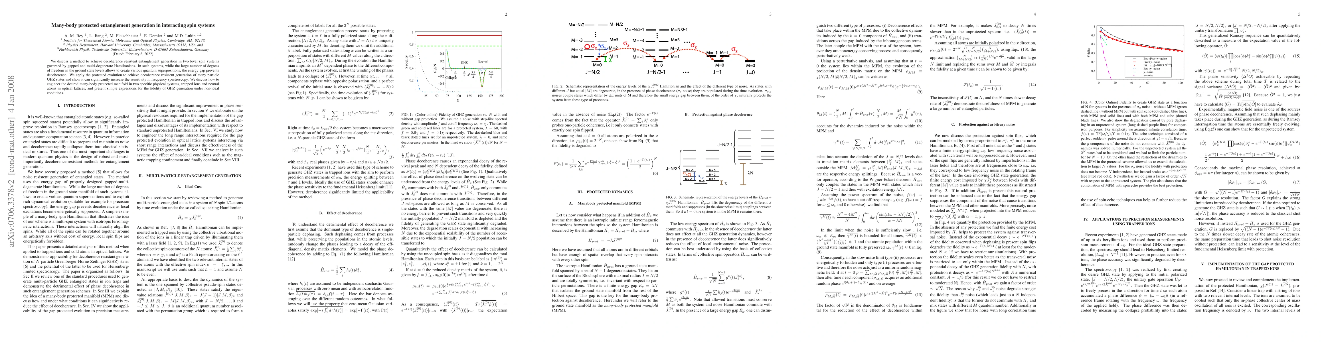 This paper presents a method for generating decoherence-resistant entanglement in interacting spin systems using gapped and multi-degenerate Hamiltonians, achieving many-body protected generation of GHZ states that enhances frequency spectroscopy sensitivity. It applies this technique to trapped ions and neutral atoms in optical lattices, providing expressions for GHZ state fidelity under non-ideal conditions.