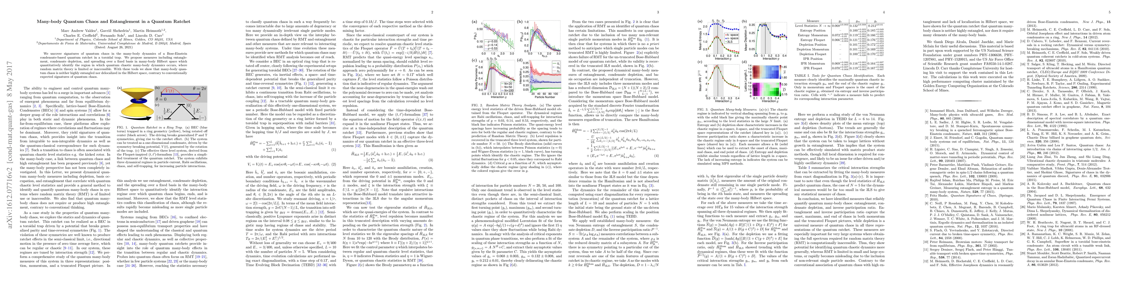This paper investigates quantum chaos in a Bose-Einstein condensate-based quantum ratchet, revealing that many-body quantum chaos manifests through entanglement, condensate depletion, and Hilbert space spreading. Contrary to conventional expectations, it finds that quantum chaos is not highly entangled or delocalized.