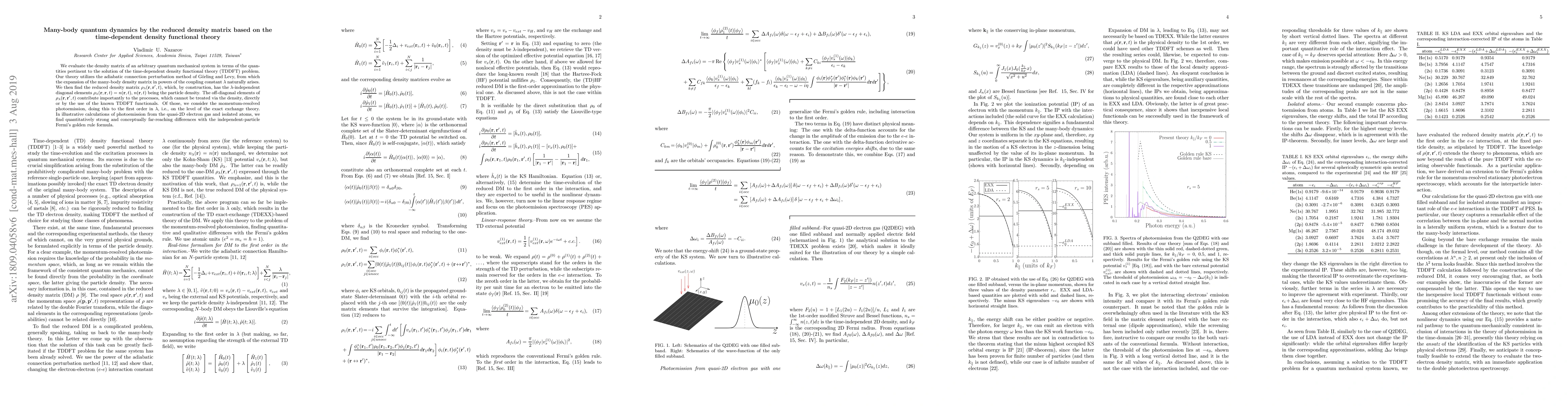 This research derives a many-body quantum dynamics model using the reduced density matrix and time-dependent density functional theory (TDDFT). It introduces a reduced density matrix, ρ_λ(r,r',t), which includes particle density n(r,t) and off-diagonal elements crucial for processes beyond standard TDDFT. The study examines momentum-resolved photoemission to first order in λ, revealing significant quantitative and conceptual differences from Fermi's golden rule in illustrative calculations of quasi-2D electron gas and isolated atoms.