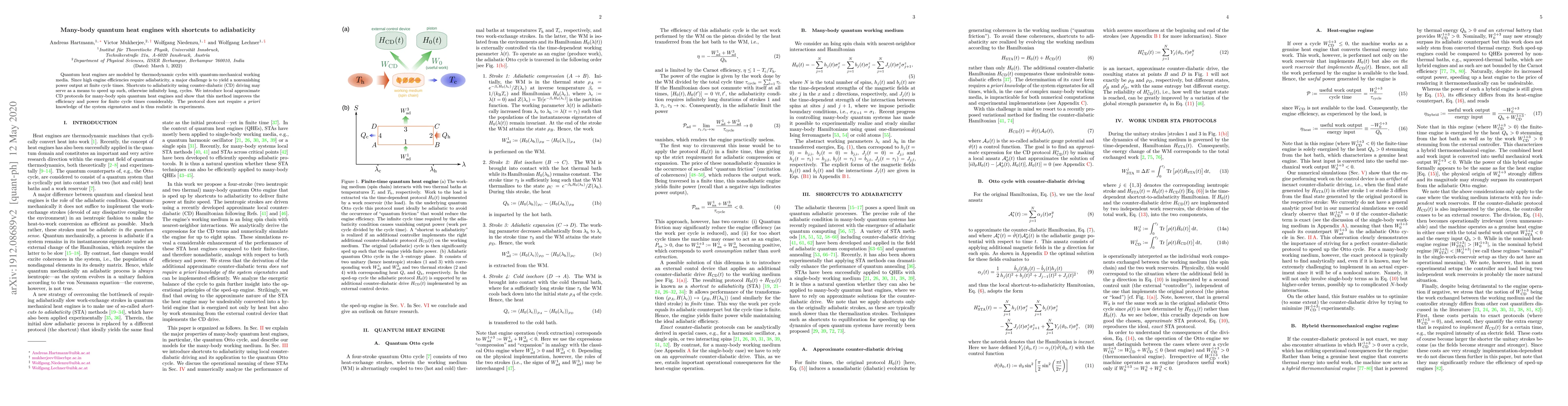 The paper presents a novel local approximate counter-diabatic driving method for many-body quantum heat engines, improving their efficiency and power output for finite cycle times.