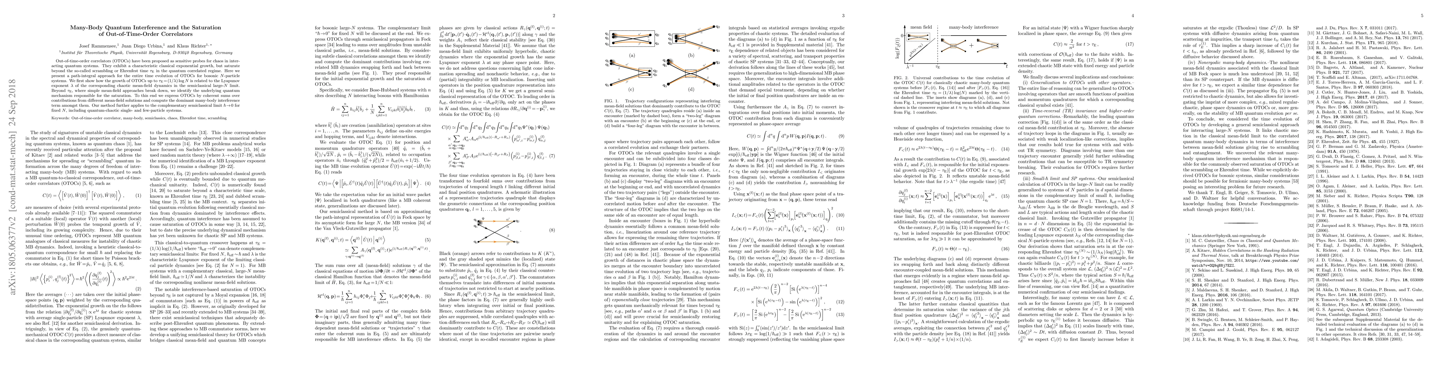 Out-of-time-order correlators (OTOCs) have been proposed as sensitive probes for chaos in interacting quantum systems. They exhibit a characteristic classical exponential growth, but saturate beyond the so-called scrambling or Ehrenfest time $\tau_{\rm E}$ in the quantum correlated regime. Here we present a path-integral approach for the entire time evolution of OTOCs for bosonic $N$-particle systems. We first show how the growth of OTOCs up to $\tau_{\rm E} = (1/\lambda) \log N$ is related to the Lyapunov exponent $\lambda$ of the corresponding chaotic mean-field dynamics in the semiclassical large-$N$ limit. Beyond $\tau_{\rm E}$, where simple mean-field approaches break down, we identify the underlying quantum mechanism responsible for the saturation. To this end we express OTOCs by coherent sums over contributions from different mean-field solutions and compute the dominant many-body interference term amongst them. Our method further applies to the complementary semiclassical limit $\hbar \rightarrow 0$ for fixed $N$, including quantum-chaotic single- and few-particle systems.